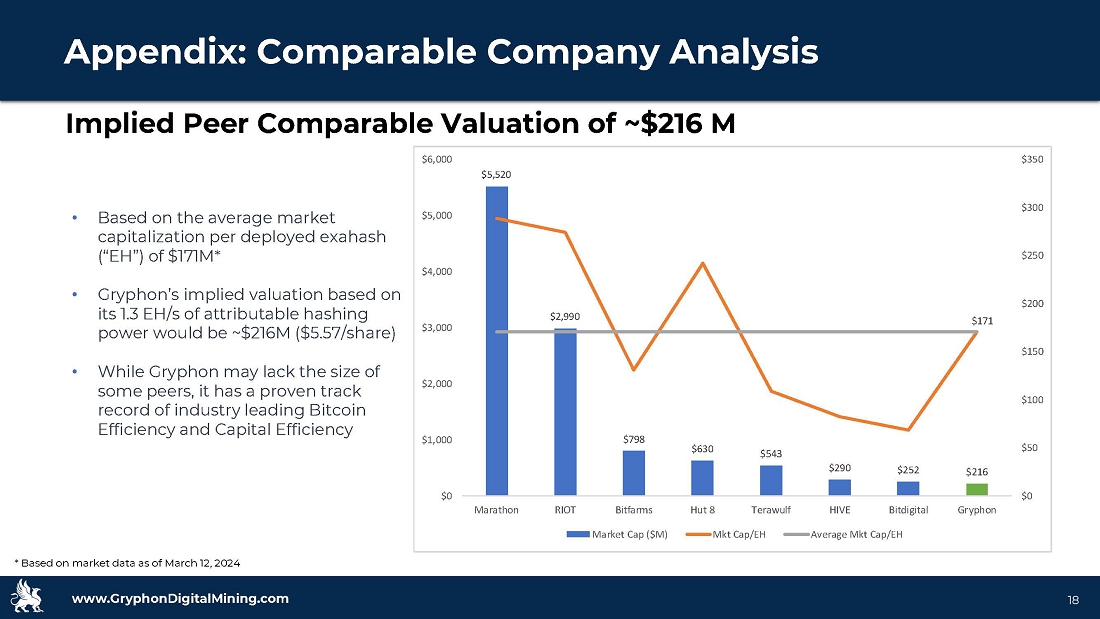 www.GryphonDigitalMining.com Target Capitalization 18 Appendix: Comparable Company Analysis • Based on the average market capitalization per deployed exahash (“EH”) of $171M* • Gryphon’s implied valuation based on its 1.3 EH/s of attributable hashing power would be ~$216M ($5.57/share) • While Gryphon may lack the size of some peers, it has a proven track record of industry leading Bitcoin Efficiency and Capital Efficiency Implied Peer Comparable Valuation of ~$216 M * Based on market data as of March 12, 2024 $5,520 $2,990 $798 $630 $543 $290 $252 $216 $171 $0 $50 $100 $150 $200 $250 $300 $350 $0 $1,000 $2,000 $3,000 $4,000 $5,000 $6,000 Marathon RIOT Bitfarms Hut 8 Terawulf HIVE Bitdigital Gryphon Market Cap ($M) Mkt Cap/EH Average Mkt Cap/EH