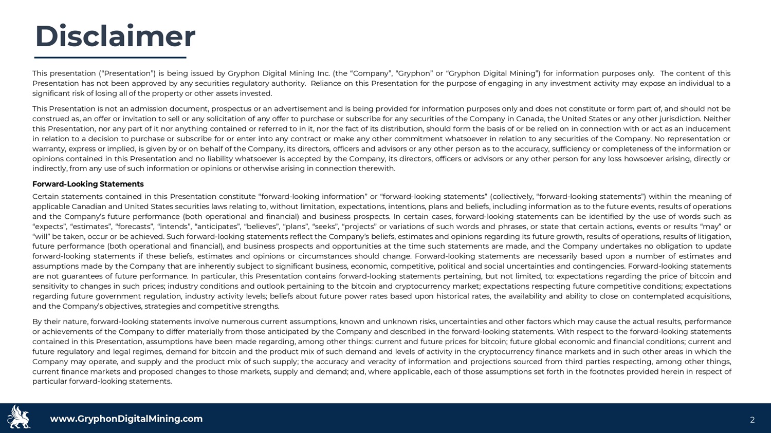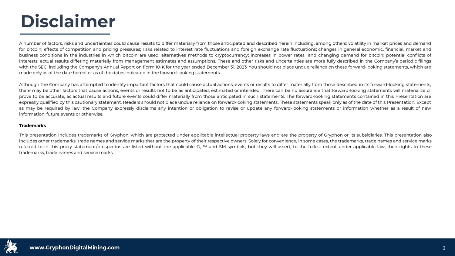 www.GryphonDigitalMining.com Disclaimer This presentation (“Presentation”) is being issued by Gryphon Digital Mining Inc . (the “Company”, “Gryphon” or “Gryphon Digital Mining”) for information purposes only . The content of this Presentation has not been approved by any securities regulatory authority . Reliance on this Presentation for the purpose of engaging in any investment activity may expose an individual to a significant risk of losing all of the property or other assets invested . This Presentation is not an admission document, prospectus or an advertisement and is being provided for information purposes only and does not constitute or form part of, and should not be construed as, an offer or invitation to sell or any solicitation of any offer to purchase or subscribe for any securities of the Company in Canada, the United States or any other jurisdiction . Neither this Presentation, nor any part of it nor anything contained or referred to in it, nor the fact of its distribution, should form the basis of or be relied on in connection with or act as an inducement in relation to a decision to purchase or subscribe for or enter into any contract or make any other commitment whatsoever in relation to any securities of the Company . No representation or warranty, express or implied, is given by or on behalf of the Company, its directors, officers and advisors or any other person as to the accuracy, sufficiency or completeness of the information or opinions contained in this Presentation and no liability whatsoever is accepted by the Company, its directors, officers or advisors or any other person for any loss howsoever arising, directly or indirectly, from any use of such information or opinions or otherwise arising in connection therewith . Forward - Looking Statements Certain statements contained in this Presentation constitute “forward - looking information” or “forward - looking statements” (collectively, “forward - looking statements”) within the meaning of applicable Canadian and United States securities laws relating to, without limitation, expectations, intentions, plans and beliefs, including information as to the future events, results of operations and the Company’s future performance (both operational and financial) and business prospects . In certain cases, forward - looking statements can be identified by the use of words such as “expects”, “estimates”, “forecasts”, “intends”, “anticipates”, “believes”, “plans”, “seeks”, “projects” or variations of such words and phrases, or state that certain actions, events or results “may” or “will” be taken, occur or be achieved . Such forward - looking statements reflect the Company’s beliefs, estimates and opinions regarding its future growth, results of operations, results of litigation, future performance (both operational and financial), and business prospects and opportunities at the time such statements are made, and the Company undertakes no obligation to update forward - looking statements if these beliefs, estimates and opinions or circumstances should change . Forward - looking statements are necessarily based upon a number of estimates and assumptions made by the Company that are inherently subject to significant business, economic, competitive, political and social uncertainties and contingencies . Forward - looking statements are not guarantees of future performance . In particular, this Presentation contains forward - looking statements pertaining, but not limited, to : expectations regarding the price of bitcoin and sensitivity to changes in such prices ; industry conditions and outlook pertaining to the bitcoin and cryptocurrency market ; expectations respecting future competitive conditions ; expectations regarding future government regulation, industry activity levels ; beliefs about future power rates based upon historical rates, the availability and ability to close on contemplated acquisitions, and the Company’s objectives, strategies and competitive strengths . By their nature, forward - looking statements involve numerous current assumptions, known and unknown risks, uncertainties and other factors which may cause the actual results, performance or achievements of the Company to differ materially from those anticipated by the Company and described in the forward - looking statements . With respect to the forward - looking statements contained in this Presentation, assumptions have been made regarding, among other things : current and future prices for bitcoin ; future global economic and financial conditions ; current and future regulatory and legal regimes, demand for bitcoin and the product mix of such demand and levels of activity in the cryptocurrency finance markets and in such other areas in which the Company may operate, and supply and the product mix of such supply ; the accuracy and veracity of information and projections sourced from third parties respecting, among other things, current finance markets and proposed changes to those markets, supply and demand ; and, where applicable, each of those assumptions set forth in the footnotes provided herein in respect of particular forward - looking statements . 2