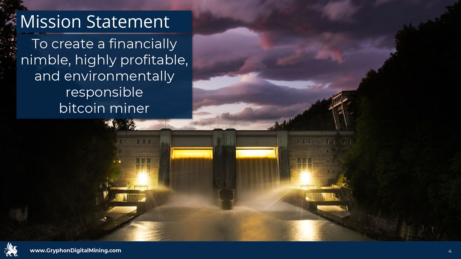 www.GryphonDigitalMining.com Disclaimer A number of factors, risks and uncertainties could cause results to differ materially from those anticipated and described herein including, among others : volatility in market prices and demand for bitcoin ; effects of competition and pricing pressures ; risks related to interest rate fluctuations and foreign exchange rate fluctuations ; changes in general economic, financial, market and business conditions in the industries in which bitcoin are used ; alternatives methods to cryptocurrency ; increases in power rates and changing demand for bitcoin ; potential conflicts of interests ; actual results differing materially from management estimates and assumptions . These and other risks and uncertainties are more fully described in the Company’s periodic filings with the SEC, including the Company’s Annual Report on Form 10 - K for the year ended December 31 , 2023 . You should not place undue reliance on these forward - looking statements, which are made only as of the date hereof or as of the dates indicated in the forward - looking statements . Although the Company has attempted to identify important factors that could cause actual actions, events or results to differ materially from those described in its forward - looking statements, there may be other factors that cause actions, events or results not to be as anticipated, estimated or intended . There can be no assurance that forward - looking statements will materialize or prove to be accurate, as actual results and future events could differ materially from those anticipated in such statements . The forward - looking statements contained in this Presentation are expressly qualified by this cautionary statement . Readers should not place undue reliance on forward - looking statements . These statements speak only as of the date of this Presentation . Except as may be required by law, the Company expressly disclaims any intention or obligation to revise or update any forward - looking statements or information whether as a result of new information, future events or otherwise . Trademarks This presentation includes trademarks of Gryphon, which are protected under applicable intellectual property laws and are the property of Gryphon or its subsidiaries . This presentation also includes other trademarks, trade names and service marks that are the property of their respective owners . Solely for convenience, in some cases, the trademarks, trade names and service marks referred to in this proxy statement/prospectus are listed without the applicable ®, and SM symbols, but they will assert, to the fullest extent under applicable law, their rights to these trademarks, trade names and service marks . 3