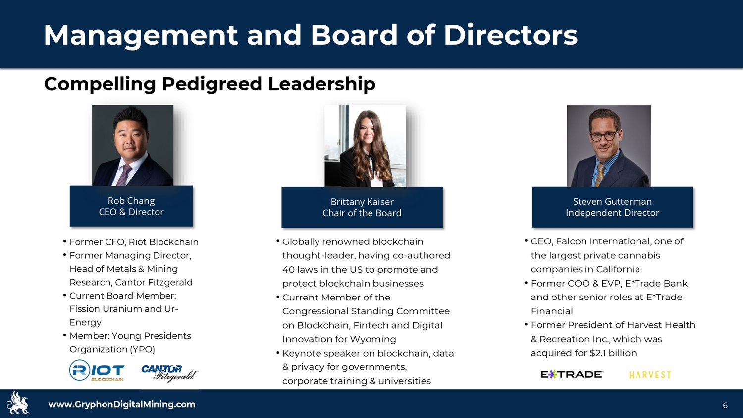 www.GryphonDigitalMining.com Target Capitalization • Independently Certified 100% Renewable Energy Operation as one of the inaugural recipients of the Green Proofs for Bitcoin certification • 100% Renewable Energy Miner pursuing a negative carbon strategy with the acquisition of carbon offset credits and mining operations • CEO & Director, Rob Chang, previously served as CFO of Riot Blockchain and as MD at Cantor Fitzgerald • Chairperson, Brittany Kaiser, globally - renowned expert in blockchain technology and digital assets • 0.94 exahash of self mining (expected 1 EH post recently announced transaction) • +500 MW pipeline of potential acquisition opportunities • $13M in mining revenues of BTC produced in YTD 2024 based on an average price of $57,628 • YTD 2024 Breakeven Cost per BTC $38,286/BTC* 5 Creating an industry leader in bitcoin mining. Size & Scale Leadership Team ESG Investment Highlights *The Company defines Breakeven cost per Bitcoin as (a) Cost of Revenues (excluding depreciation) divided by (b) total bitcoin ge nerated and received from the hashrate contributed to the mining pool operator. See Appendix: Non - GAAP Reconciliations.