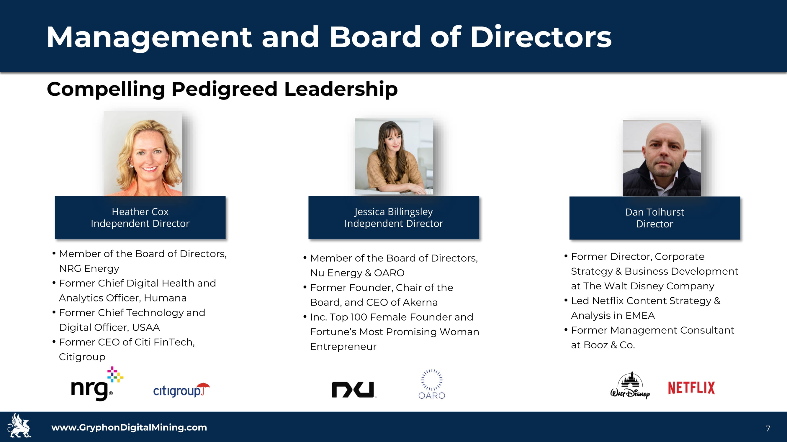 www.GryphonDigitalMining.com Target Capitalization 6 Compelling Pedigreed Leadership • CEO, Falcon International, one of the largest private cannabis companies in California • Former COO & EVP, E*Trade Bank and other senior roles at E*Trade Financial • Former President of Harvest Health & Recreation Inc., which was acquired for $2.1 billion Steven Gutterman Independent Director Management and Board of Directors • Globally renowned blockchain thought - leader, having co - authored 40 laws in the US to promote and protect blockchain businesses • Current Member of the Congressional Standing Committee on Blockchain, Fintech and Digital Innovation for Wyoming • Keynote speaker on blockchain, data & privacy for governments, corporate training & universities Brittany Kaiser Chair of the Board • Former CFO, Riot Blockchain • Former Managing Director, Head of Metals & Mining Research, Cantor Fitzgerald • Current Board Member: Fission Uranium and Ur - Energy • Member: Young Presidents Organization (YPO) Rob Chang CEO & Director