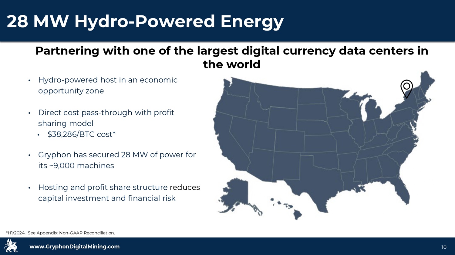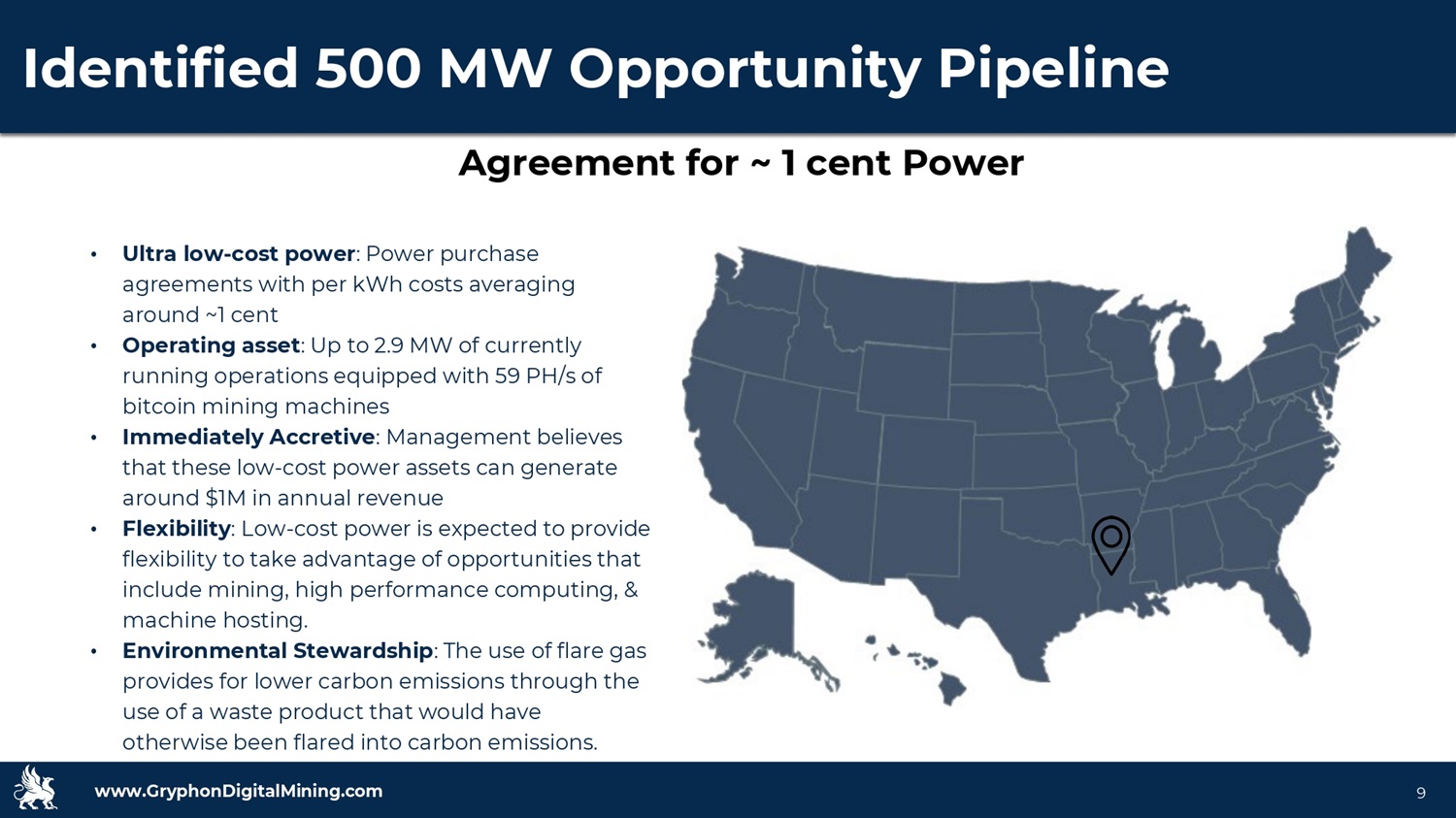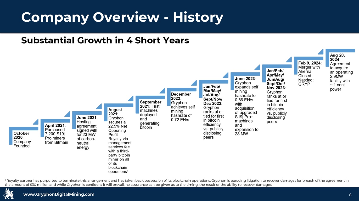 www.GryphonDigitalMining.com Target Capitalization October 2020 : Company Founded April 2021 : Purchased 7,200 S19j Pro miners from Bitmain June 2021 : Hosting agreement signed with for 23 MW of carbon - neutral energy August 2021 : Gryphon secures a 22.5% Net Operating Profit Royalty via management services fee with a third - party bitcoin miner on all of its blockchain operations 1 September 2021 : First machines deployed and generating bitcoin December 2022 : Gryphon achieves self mining hashrate of 0.72 EH/s Jan/Feb/ Mar/May/ Jul/Aug/ Sept/Nov/ Dec 2022 : Gryphon ranks at or tied for first in bitcoin efficiency vs. publicly disclosing peers June 2023 : Gryphon expands self mining hashrate to 0.86 EH/s with acquisition of upgraded S19j Pro+ machines and expansion to 28 MW Jan/Feb/ Apr/May/ Jun/Aug/ Sept/Oct/ Nov 2023 : Gryphon ranks at or tied for first in bitcoin efficiency vs. publicly disclosing peers Feb 9, 2024 : Merger with Akerna Closed. Nasdaq: GRYP Aug 20, 2024 : Agreement to acquire an operating 2.9MW facility with ~ 1 cent power 8 Substantial Growth in 4 Short Years Company Overview - History 1 Royalty partner has purported to terminate this arrangement and has taken back possession of its blockchain operations. Gryph on is pursuing litigation to recover damages for breach of the agreement in the amount of $30 million and while Gryphon is confident it will prevail, no assurance can be given as to the timing, the res ult or the ability to recover damages.