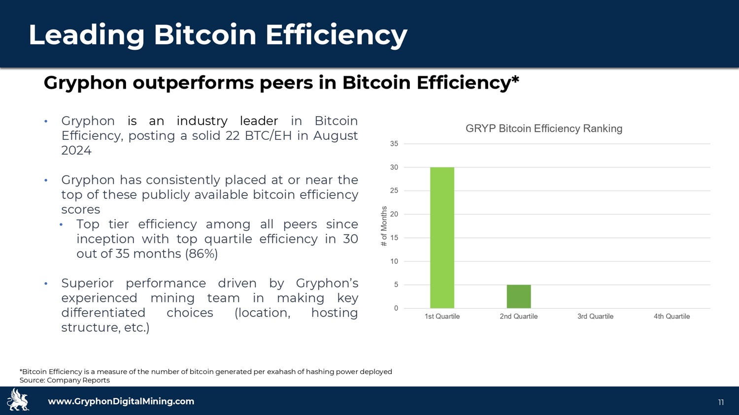 www.GryphonDigitalMining.com Target Capitalization • Hydro - powered host in an economic opportunity zone • Direct cost pass - through with profit sharing model • $38,286/BTC cost* • Gryphon has secured 28 MW of power for its ~9,000 machines • Hosting and profit share structure reduces capital investment and financial risk 10 Partnering with one of the largest digital currency data centers in the world 28 MW Hydro - Powered Energy *H1/2024. See Appendix: Non - GAAP Reconciliation.