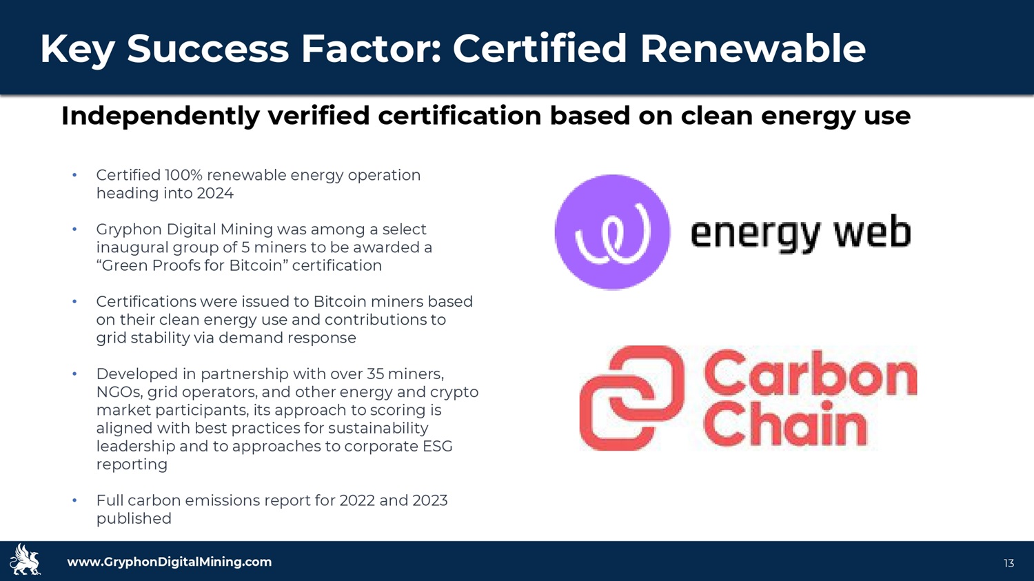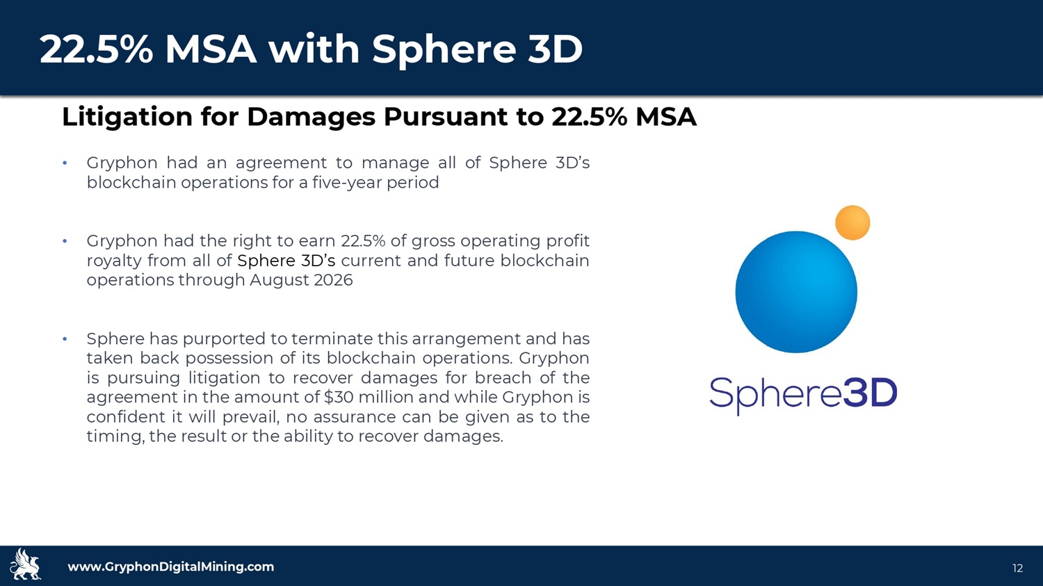 www.GryphonDigitalMining.com Target Capitalization • Gryphon had an agreement to manage all of Sphere 3 D’s blockchain operations for a five - year period • Gryphon had the right to earn 22 . 5 % of gross operating profit royalty from all of Sphere 3 D’s current and future blockchain operations through August 2026 • Sphere has purported to terminate this arrangement and has taken back possession of its blockchain operations . Gryphon is pursuing litigation to recover damages for breach of the agreement in the amount of $ 30 million and while Gryphon is confident it will prevail, no assurance can be given as to the timing, the result or the ability to recover damages . 12 Litigation for Damages Pursuant to 22.5% MSA 22.5% MSA with Sphere 3D