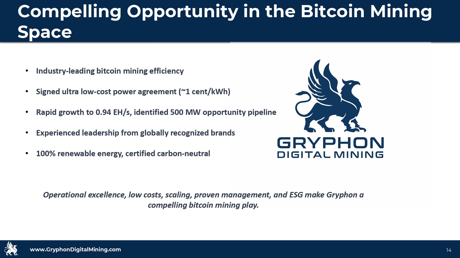 www.GryphonDigitalMining.com Target Capitalization • Certified 100% renewable energy operation heading into 2024 • Gryphon Digital Mining was among a select inaugural group of 5 miners to be awarded a “ Green Proofs for Bitcoin” certification • Certifications were issued to Bitcoin miners based on their clean energy use and contributions to grid stability via demand response • Developed in partnership with over 35 miners, NGOs, grid operators, and other energy and crypto market participants, its approach to scoring is aligned with best practices for sustainability leadership and to approaches to corporate ESG reporting • Full carbon emissions report for 2022 and 2023 published 13 Independently verified certification based on clean energy use Key Success Factor: Certified Renewable