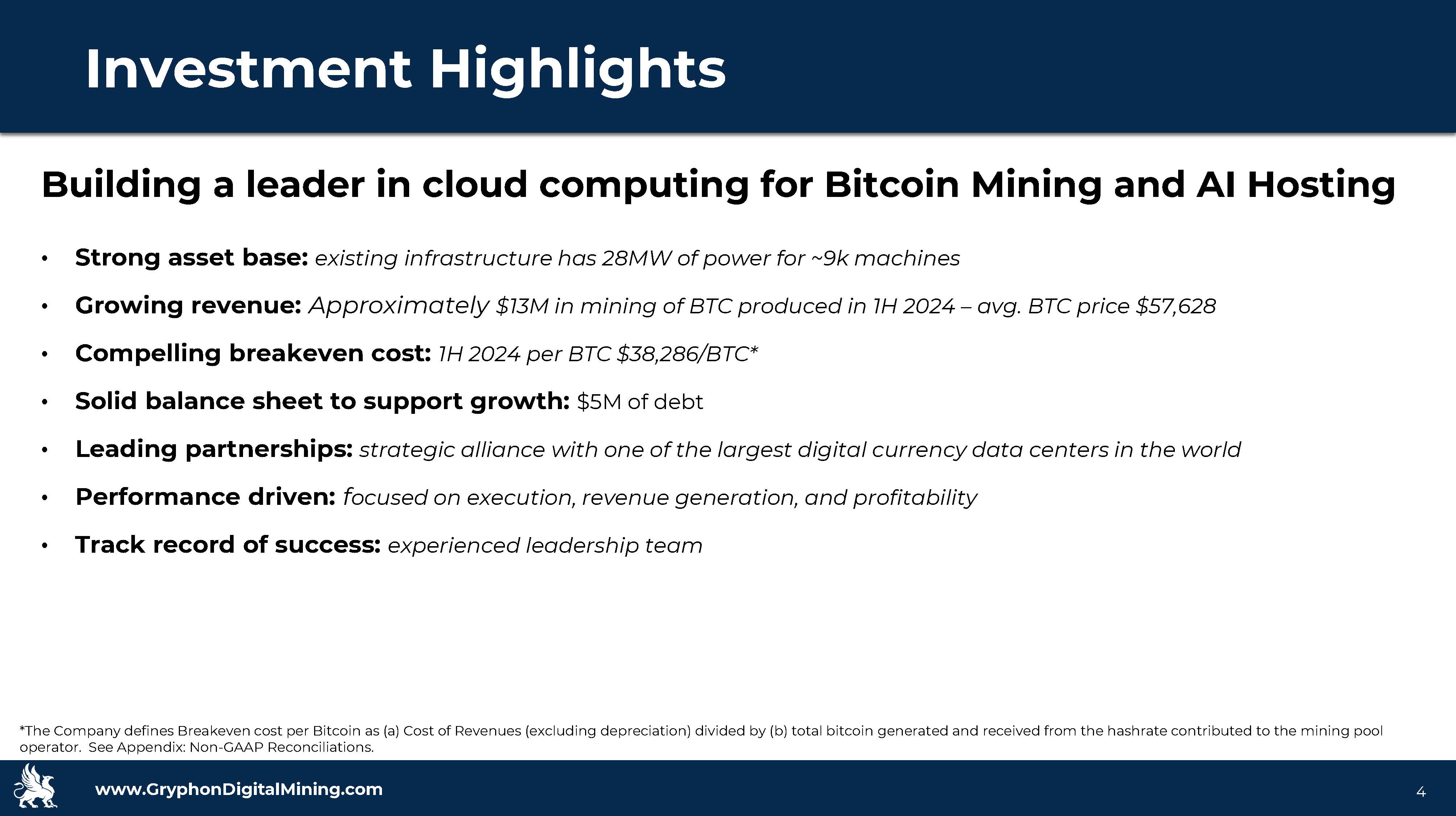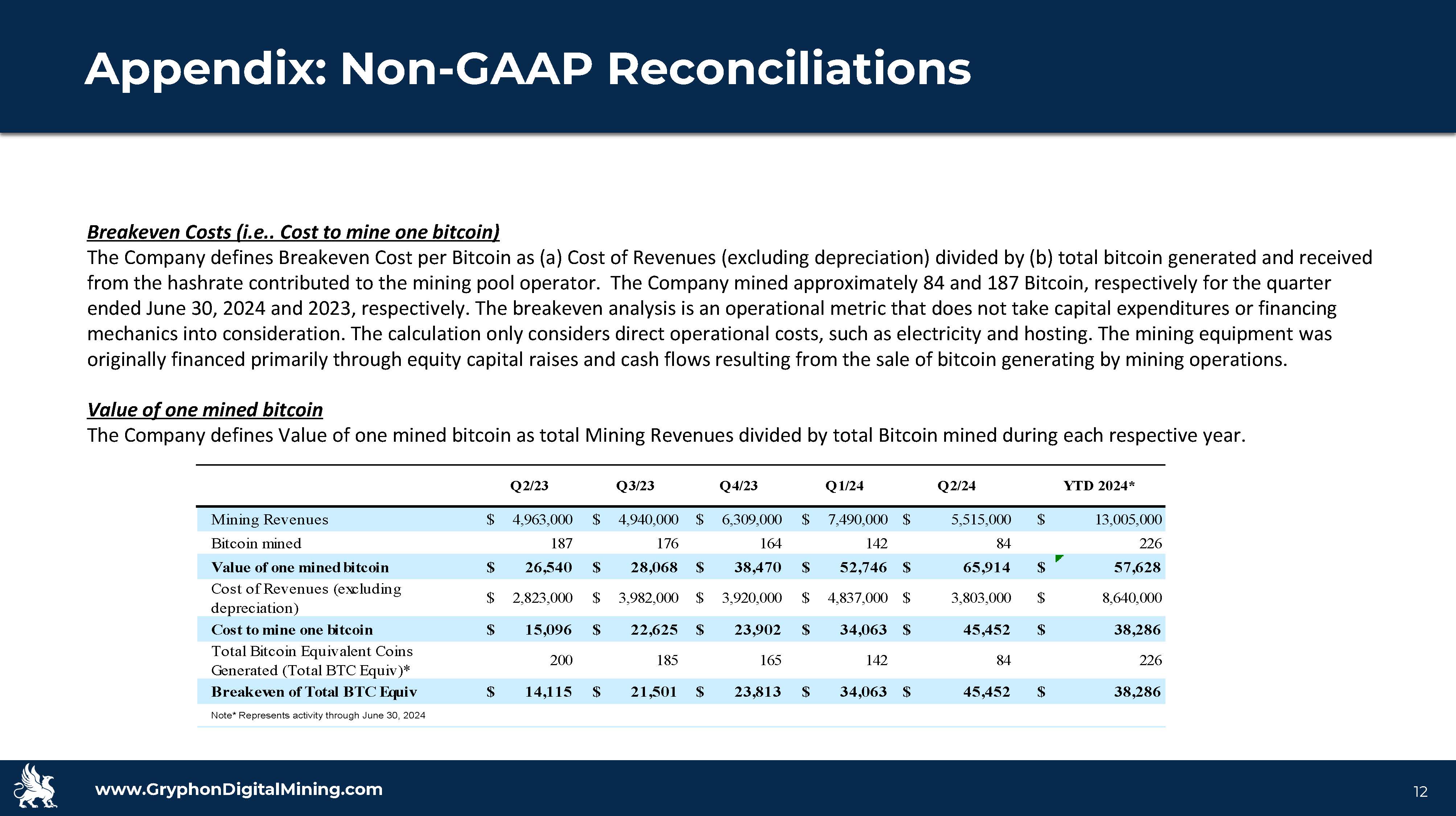 www.GryphonDigitalMining.com Target Capitalization 13 Appendix: Non - GAAP Reconciliations Breakeven Costs (i.e.. Cost to mine one bitcoin) The Company defines Breakeven Cost per Bitcoin as (a) Cost of Revenues (excluding depreciation) divided by (b) total bitcoin gen erated and received from the hashrate contributed to the mining pool operator. The Company mined approximately 84 and 187 Bitcoin, respectively for the quarter ended June 30, 2024 and 2023, respectively. The breakeven analysis is an operational metric that does not take capital expenditures or financing mechanics into consideration. The calculation only considers direct operational costs, such as electricity and hosting. The m ini ng equipment was originally financed primarily through equity capital raises and cash flows resulting from the sale of bitcoin generating by m ini ng operations. Value of one mined bitcoin The Company defines Value of one mined bitcoin as total Mining Revenues divided by total Bitcoin mined during each respective ye ar. Mining Revenues $ 4,963,000 $ 4,940,000 $ 6,309,000 $ 7,490,000 $ 5,515,000 $ 13,005,000 Bitcoin mined 187 176 164 142 84 226 Value of one mined bitcoin $ 26,540 $ 28,068 $ 38,470 $ 52,746 $ 65,914 $ 57,628 Cost of Revenues (excluding depreciation) $ 2,823,000 $ 3,982,000 $ 3,920,000 $ 4,837,000 $ 3,803,000 $ 8,640,000 Cost to mine one bitcoin $ 15,096 $ 22,625 $ 23,902 $ 34,063 $ 45,452 $ 38,286 Total Bitcoin Equivalent Coins Generated (Total BTC Equiv)* 200 185 165 142 84 226 Breakeven of Total BTC Equiv $ 14,115 $ 21,501 $ 23,813 $ 34,063 $ 45,452 $ 38,286 Note* Represents activity through June 30, 2024 YTD 2024*Q2/24Q1/24Q2/23 Q3/23 Q4/23