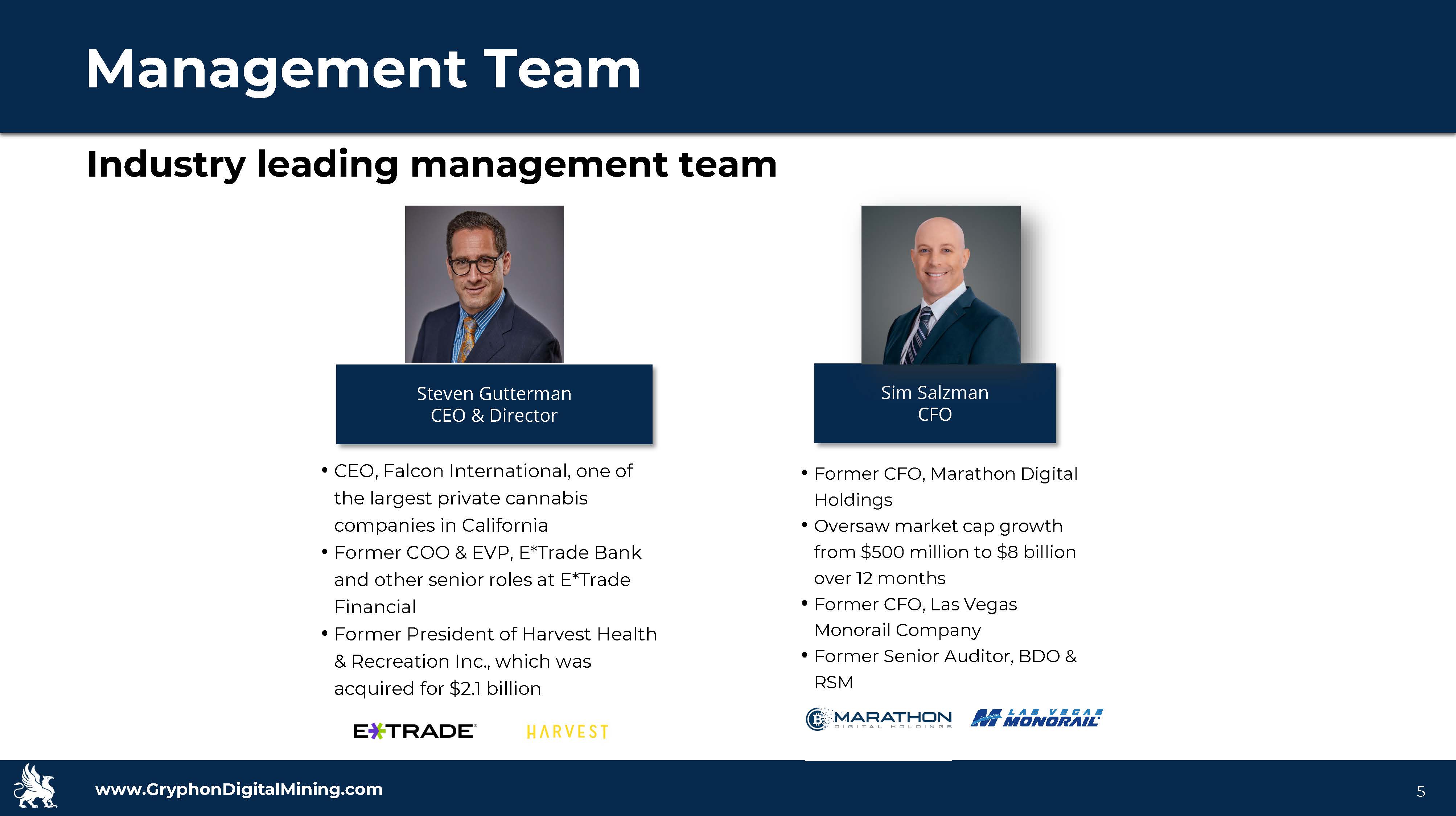 www.GryphonDigitalMining.com Target Capitalization • Strong asset base: existing infrastructure has 28MW of power for ~9k machines • Low energy costs: <$0.03 cost/ KwH • Growing revenue: Approximately $13M in mining of BTC produced in 1H 2024 – avg. BTC price $57,628 • Compelling breakeven cost: 1H 2024 per BTC $38,286/BTC* • Solid balance sheet to support growth: $5M of debt • Leading partnerships: strategic alliance with one of the largest digital currency data centers in the world • Performance driven: f ocused on execution, revenue generation, and profitability • Track Record of Success: experienced leadership team • Market Opportunity: we believe we are poised capitalize on rapid growth opportunities in cloud computing 4 Building a leader in cloud computing for Bitcoin Mining and AI Hosting Investment Highlights *The Company defines Breakeven cost per Bitcoin as (a) Cost of Revenues (excluding depreciation) divided by (b) total bitcoin ge nerated and received from the hashrate contributed to the mining pool operator. See Appendix: Non - GAAP Reconciliations.