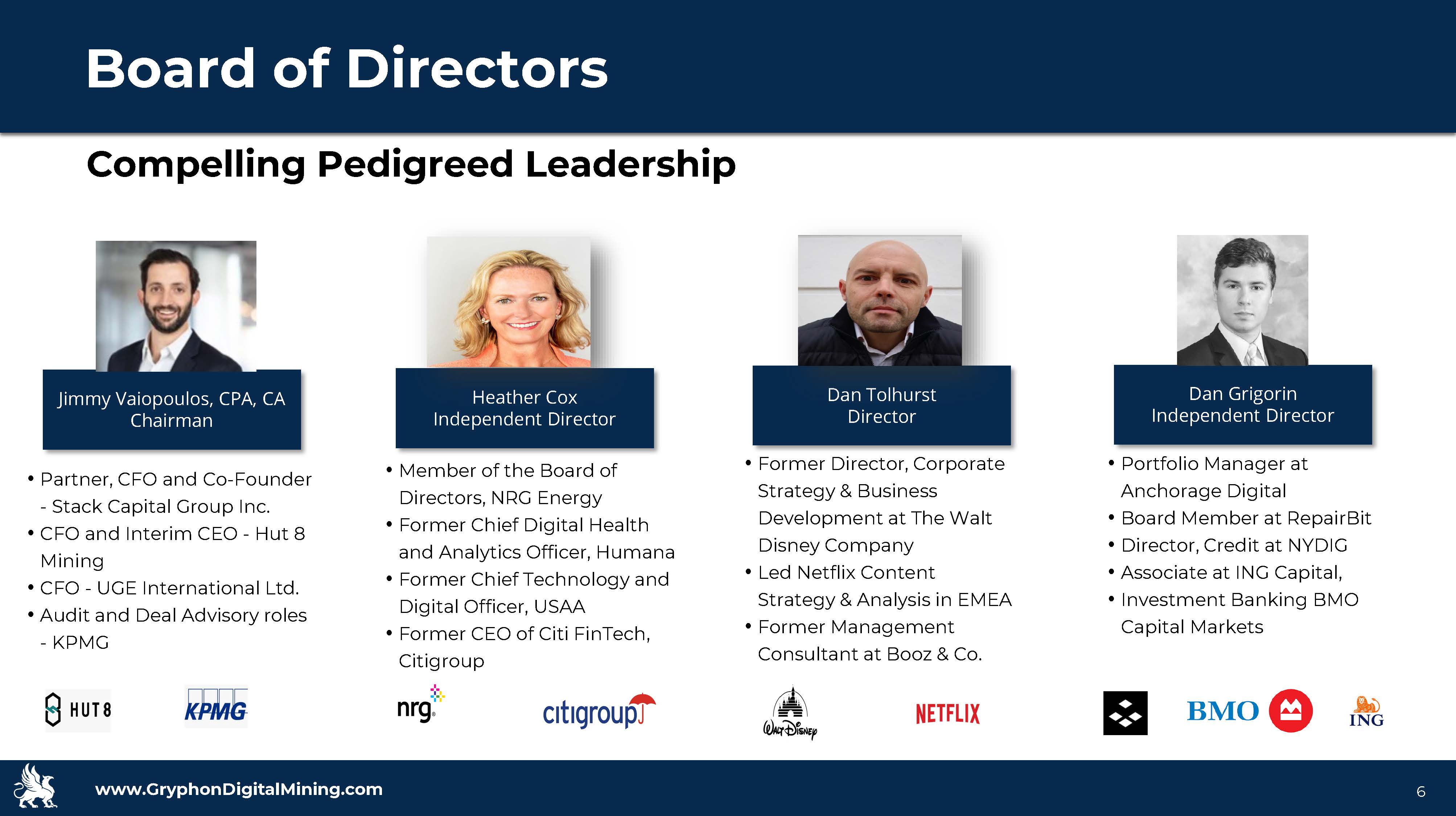 www.GryphonDigitalMining.com Target Capitalization 5 Industry leading management team Management Team • Former CFO, Marathon Digital Holdings • Oversaw market cap growth from $500 million to $8 billion over 12 months • Former CFO, Las Vegas Monorail Company • Former Senior Auditor, BDO & RSM Sim Salzman CFO • CEO, Falcon International, one of the largest private cannabis companies in California • Former COO & EVP, E*Trade Bank and other senior roles at E*Trade Financial • Former President of Harvest Health & Recreation Inc., which was acquired for $2.1 billion Steven Gutterman CEO & Director