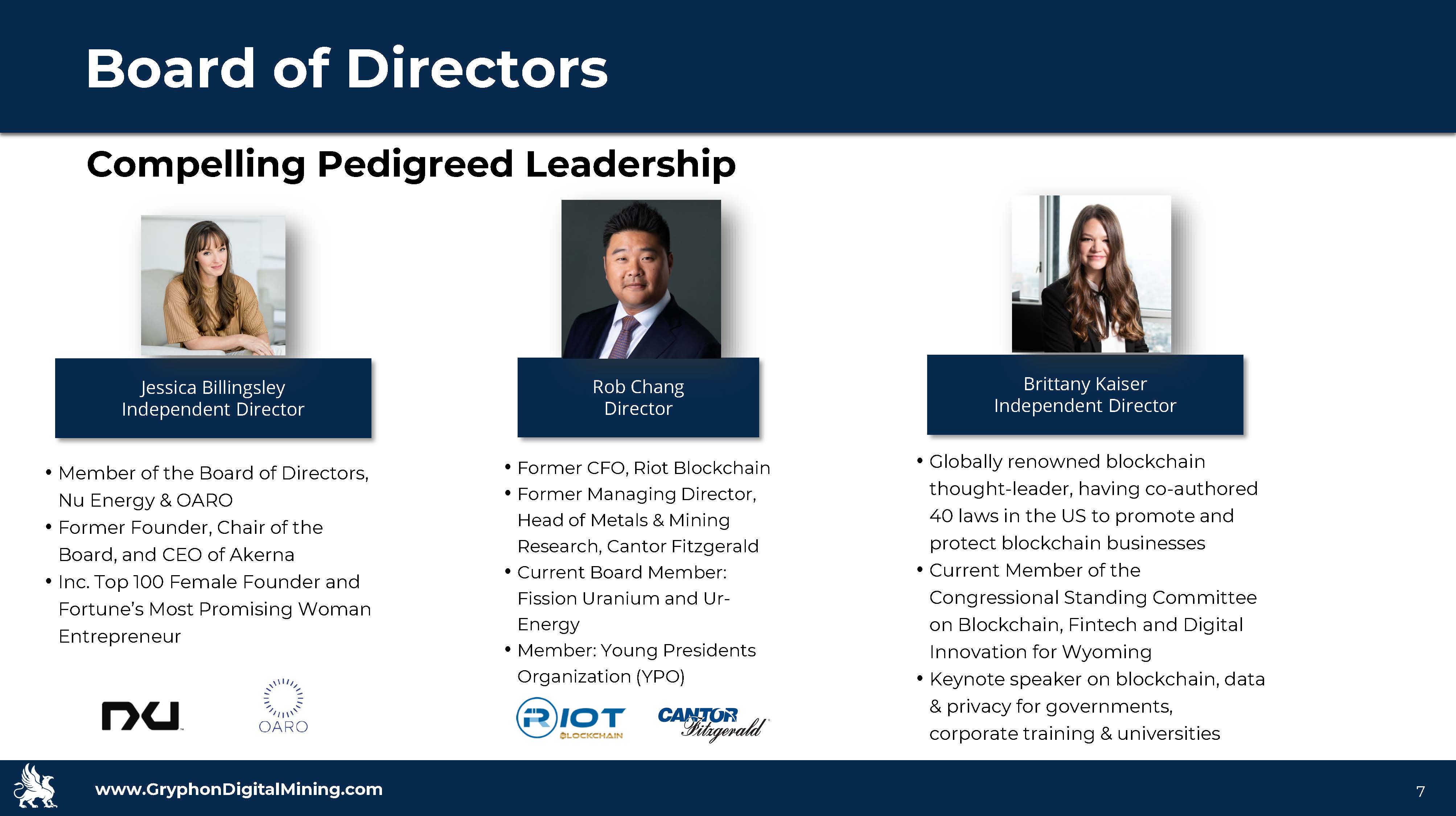 www.GryphonDigitalMining.com Target Capitalization 7 Compelling Pedigreed Leadership • Member of the Board of Directors, Nu Energy & OARO • Former Founder, Chair of the Board, and CEO of Akerna • Inc. Top 100 Female Founder and Fortune’s Most Promising Woman Entrepreneur Board of Directors Jessica Billingsley Independent Director • Former CFO, Riot Blockchain • Former Managing Director, Head of Metals & Mining Research, Cantor Fitzgerald • Current Board Member: Fission Uranium and Ur - Energy • Member: Young Presidents Organization (YPO) Rob Chang Director • Globally renowned blockchain thought - leader, having co - authored 40 laws in the US to promote and protect blockchain businesses • Current Member of the Congressional Standing Committee on Blockchain, Fintech and Digital Innovation for Wyoming • Keynote speaker on blockchain, data & privacy for governments, corporate training & universities Brittany Kaiser Independent Director