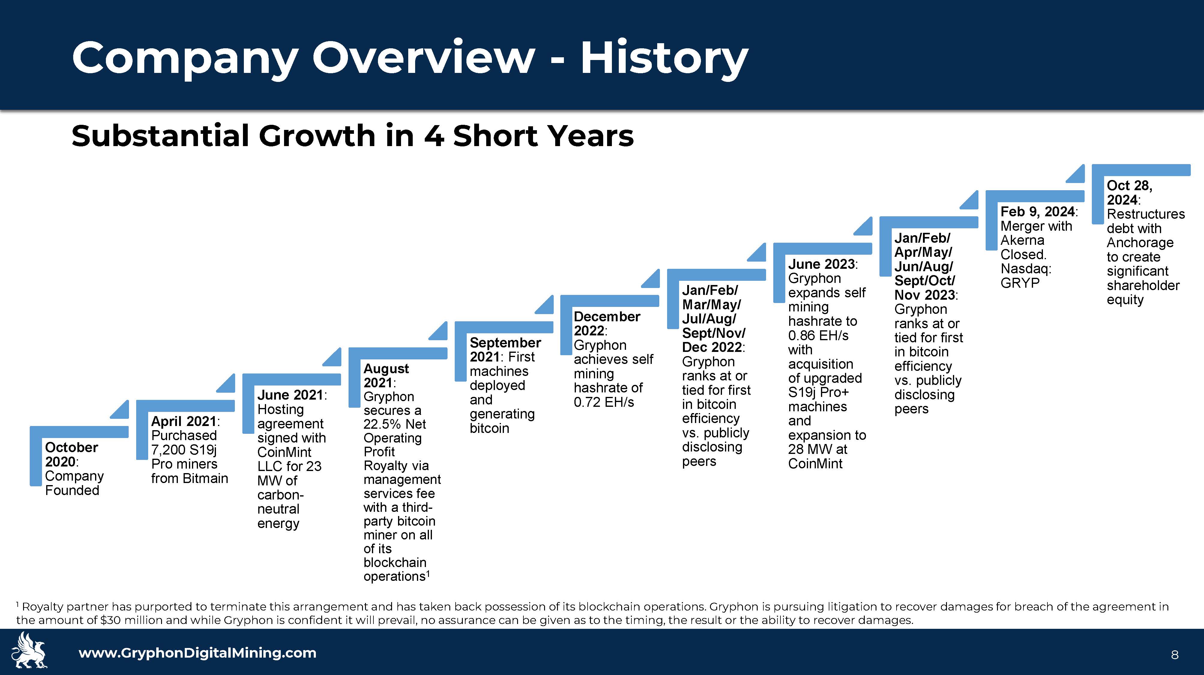www.GryphonDigitalMining.com Target Capitalization October 2020 : Company Founded April 2021 : Purchased 7,200 S19j Pro miners from Bitmain June 2021 : Hosting agreement signed with CoinMint LLC for 23 MW of carbon - neutral energy August 2021 : Gryphon secures a 22.5% Net Operating Profit Royalty via management services fee with a third - party bitcoin miner on all of its blockchain operations 1 September 2021 : First machines deployed and generating bitcoin December 2022 : Gryphon achieves self mining hashrate of 0.72 EH/s Jan/Feb/ Mar/May/ Jul/Aug/ Sept/Nov/ Dec 2022 : Gryphon ranks at or tied for first in bitcoin efficiency vs. publicly disclosing peers June 2023 : Gryphon expands self mining hashrate to 0.86 EH/s with acquisition of upgraded S19j Pro+ machines and expansion to 28 MW at CoinMint Jan/Feb/ Apr/May/ Jun/Aug/ Sept/Oct/ Nov 2023 : Gryphon ranks at or tied for first in bitcoin efficiency vs. publicly disclosing peers Feb 9, 2024 : Merger with Akerna Closed. Nasdaq: GRYP Aug 20, 2024 : agreement to acquire an operating 2.9MW facility with ~ 1 cent power 8 Substantial Growth in 4 Short Years Company Overview - History 1 Royalty partner has purported to terminate this arrangement and has taken back possession of its blockchain operations. Gryph on is pursuing litigation to recover damages for breach of the agreement in the amount of $30 million and while Gryphon is confident it will prevail, no assurance can be given as to the timing, the res ult or the ability to recover damages.