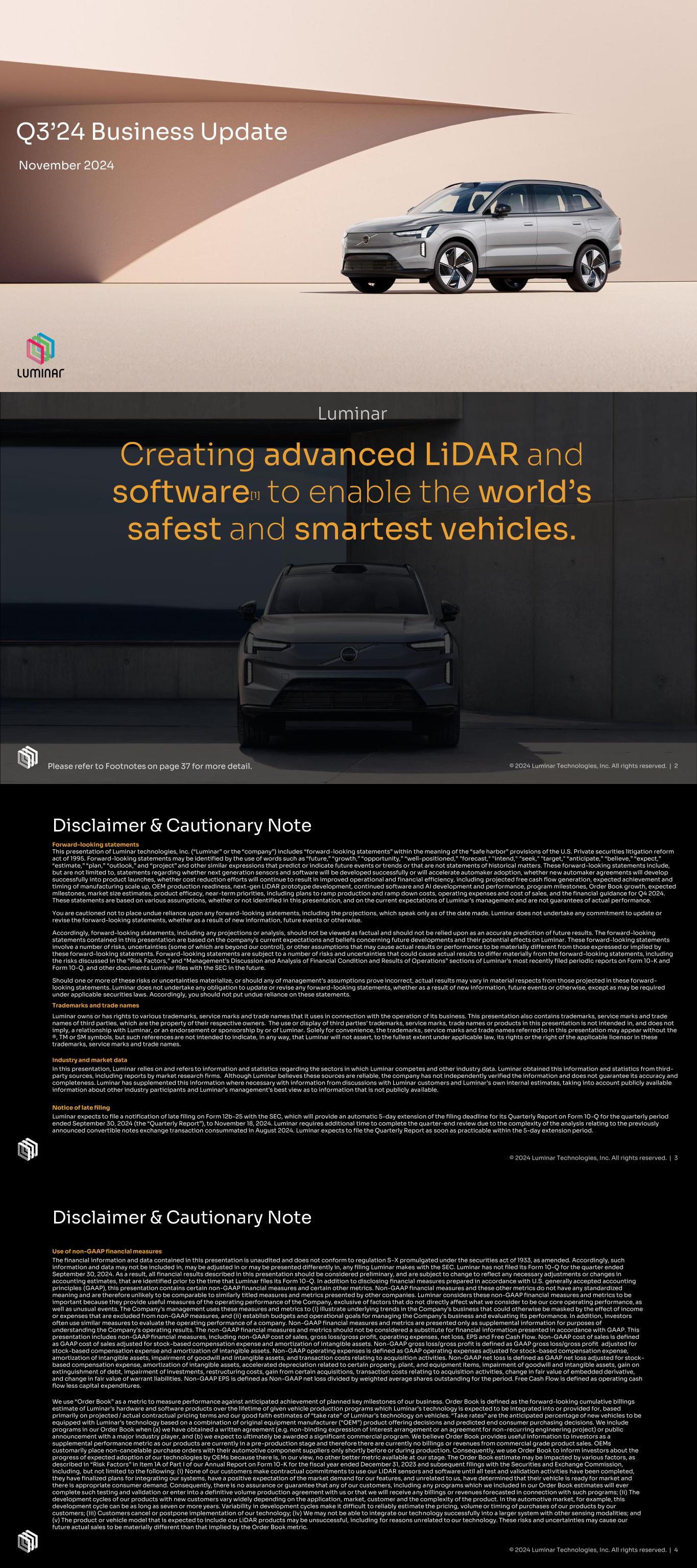 Q3’24 Business Update November 2024 © 2024 Luminar Technologies, Inc. All rights reserved. | 2 Luminar Creating advanced LiDAR and software[1] to enable the world’s safest and smartest vehicles. Please refer to Footnotes on page 37 for more detail. © 2024 Luminar Technologies, Inc. All rights reserved. | 3 Forward-looking statements This presentation of Luminar technologies, inc. (“Luminar” or the “company”) includes “forward-looking statements” within the meaning of the “safe harbor” provisions of the U.S. Private securities litigation reform act of 1995. Forward-looking statements may be identified by the use of words such as “future,” “growth,” “opportunity,” “well-positioned,” "forecast," "intend," "seek," "target," “anticipate,” “believe,” “expect,” “estimate,” “plan,” “outlook,” and “project” and other similar expressions that predict or indicate future events or trends or that are not statements of historical matters. These forward-looking statements include, but are not limited to, statements regarding whether next generation sensors and software will be developed successfully or will accelerate automaker adoption, whether new automaker agreements will develop successfully into product launches, whether cost reduction efforts will continue to result in improved operational and financial efficiency, including projected free cash flow generation, expected achievement and timing of manufacturing scale up, OEM production readiness, next-gen LiDAR prototype development, continued software and AI development and performance, program milestones, Order Book growth, expected milestones, market size estimates, product efficacy, near-term priorities, including plans to ramp production and ramp down costs, operating expenses and cost of sales, and the financial guidance for Q4 2024. These statements are based on various assumptions, whether or not identified in this presentation, and on the current expectations of Luminar’s management and are not guarantees of actual performance. You are cautioned not to place undue reliance upon any forward-looking statements, including the projections, which speak only as of the date made. Luminar does not undertake any commitment to update or revise the forward-looking statements, whether as a result of new information, future events or otherwise. Accordingly, forward-looking statements, including any projections or analysis, should not be viewed as factual and should not be relied upon as an accurate prediction of future results. The forward-looking statements contained in this presentation are based on the company’s current expectations and beliefs concerning future developments and their potential effects on Luminar. These forward-looking statements involve a number of risks, uncertainties (some of which are beyond our control), or other assumptions that may cause actual results or performance to be materially different from those expressed or implied by these forward-looking statements. Forward-looking statements are subject to a number of risks and uncertainties that could cause actual results to differ materially from the forward-looking statements, including the risks discussed in the “Risk Factors,” and “Management’s Discussion and Analysis of Financial Condition and Results of Operations” sections of Luminar’s most recently filed periodic reports on Form 10-K and Form 10-Q, and other documents Luminar files with the SEC in the future. Should one or more of these risks or uncertainties materialize, or should any of management’s assumptions prove incorrect, actual results may vary in material respects from those projected in these forward- looking statements. Luminar does not undertake any obligation to update or revise any forward-looking statements, whether as a result of new information, future events or otherwise, except as may be required under applicable securities laws. Accordingly, you should not put undue reliance on these statements. Trademarks and trade names Luminar owns or has rights to various trademarks, service marks and trade names that it uses in connection with the operation of its business. This presentation also contains trademarks, service marks and trade names of third parties, which are the property of their respective owners. The use or display of third parties’ trademarks, service marks, trade names or products in this presentation is not intended in, and does not imply, a relationship with Luminar, or an endorsement or sponsorship by or of Luminar. Solely for convenience, the trademarks, service marks and trade names referred to in this presentation may appear without the ®, TM or SM symbols, but such references are not intended to indicate, in any way, that Luminar will not assert, to the fullest extent under applicable law, its rights or the right of the applicable licensor in these trademarks, service marks and trade names. Industry and market data In this presentation, Luminar relies on and refers to information and statistics regarding the sectors in which Luminar competes and other industry data. Luminar obtained this information and statistics from third- party sources, including reports by market research firms. Although Luminar believes these sources are reliable, the company has not independently verified the information and does not guarantee its accuracy and completeness. Luminar has supplemented this information where necessary with information from discussions with Luminar customers and Luminar’s own internal estimates, taking into account publicly available information about other industry participants and Luminar’s management’s best view as to information that is not publicly available. Notice of late filing Luminar expects to file a notification of late filing on Form 12b-25 with the SEC, which will provide an automatic 5-day extension of the filing deadline for its Quarterly Report on Form 10-Q for the quarterly 