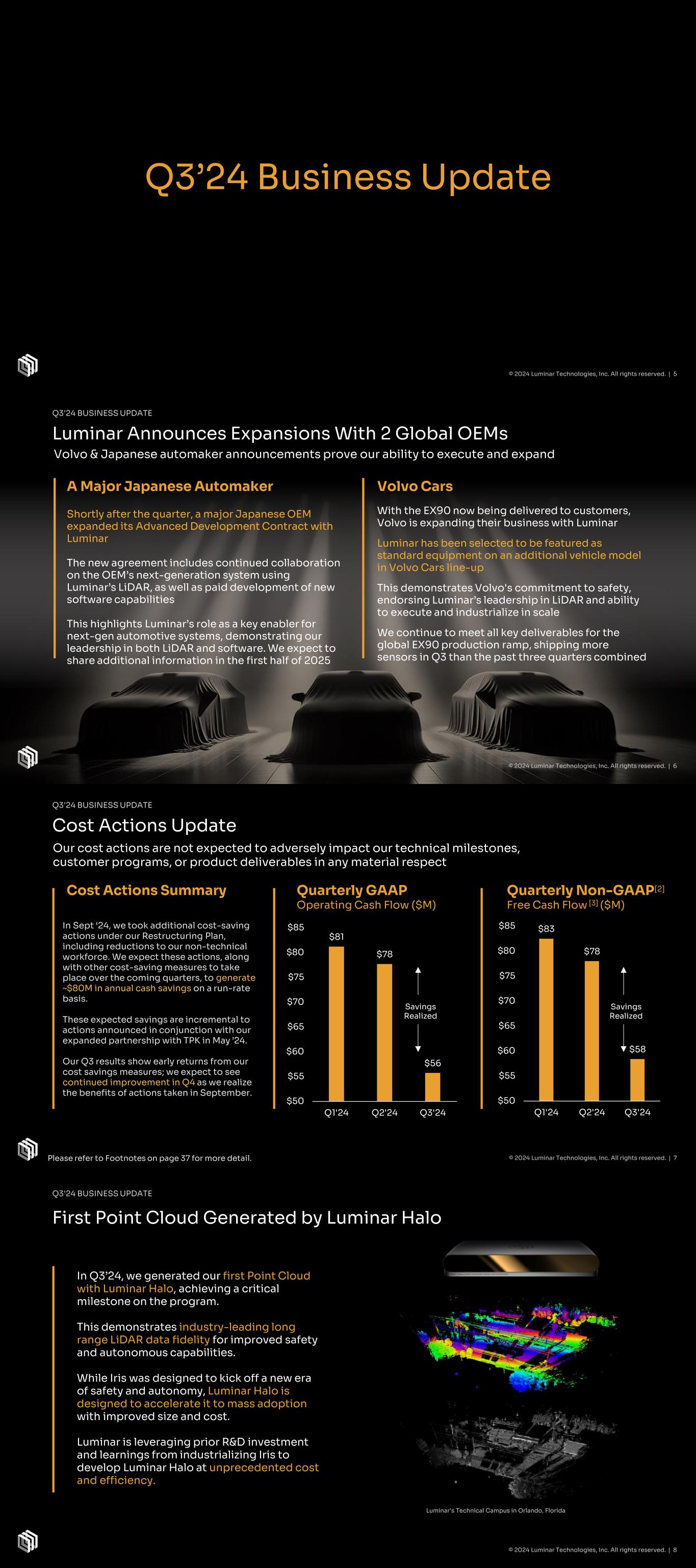 © 2024 Luminar Technologies, Inc. All rights reserved. | 5 Q3’24 Business Update © 2024 Luminar Technologies, Inc. All rights reserved. | 6 Q3'24 BUSINESS UPDATE Luminar Announces Expansions With 2 Global OEMs Shortly after the quarter, a major Japanese OEM expanded its Advanced Development Contract with Luminar The new agreement includes continued collaboration on the OEM’s next-generation system using Luminar’s LiDAR, as well as paid development of new software capabilities This highlights Luminar’s role as a key enabler for next-gen automotive systems, demonstrating our leadership in both LiDAR and software. We expect to share additional information in the first half of 2025 With the EX90 now being delivered to customers, Volvo is expanding their business with Luminar Luminar has been selected to be featured as standard equipment on an additional vehicle model in Volvo Cars line-up This demonstrates Volvo's commitment to safety, endorsing Luminar’s leadership in LiDAR and ability to execute and industrialize in scale We continue to meet all key deliverables for the global EX90 production ramp, shipping more sensors in Q3 than the past three quarters combined Volvo & Japanese automaker announcements prove our ability to execute and expand A Major Japanese Automaker Volvo Cars © 2024 Luminar Technologies, Inc. All rights reserved. | 7 Q3'24 BUSINESS UPDATE Cost Actions Update In Sept ‘24, we took additional cost-saving actions under our Restructuring Plan, including reductions to our non-technical workforce. We expect these actions, along with other cost-saving measures to take place over the coming quarters, to generate ~$80M in annual cash savings on a run-rate basis. These expected savings are incremental to actions announced in conjunction with our expanded partnership with TPK in May ’24. Our Q3 results show early returns from our cost savings measures; we expect to see continued improvement in Q4 as we realize the benefits of actions taken in September. Cost Actions Summary Our cost actions are not expected to adversely impact our technical milestones, customer programs, or product deliverables in any material respect Please refer to Footnotes on page 37 for more detail. Quarterly GAAP Operating Cash Flow ($M) Quarterly Non-GAAP[2] Free Cash Flow [3] ($M) Savings Realized Savings Realized $81 $78 $56 $50 $55 $60 $65 $70 $75 $80 $85 Q1'24 Q2'24 Q3'24 $83 $78 $58 $50 $55 $60 $65 $70 $75 $80 $85 Q1'24 Q2'24 Q3'24 © 2024 Luminar Technologies, Inc. All rights reserved. | 8 Q3'24 BUSINESS UPDATE First Point Cloud Generated by Luminar Halo In Q3’24, we generated our first Point Cloud with Luminar Halo, achieving a critical milestone on the program. This demonstrates industry-leading long range LiDAR data fidelity for improved safety and autonomous capabilities. While Iris was designed to kick off a new era of safety and autonomy, Luminar Halo is designed to accelerate it to mass adoption with improved size and cost. Luminar is leveraging prior R&D investment and learnings from industrializing Iris to develop Luminar Halo at unprecedented cost and efficiency. Luminar's Technical Campus in Orlando, Florida