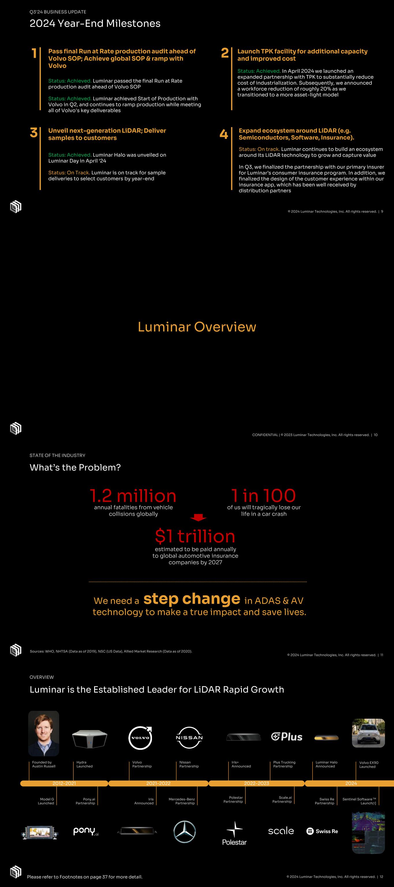 © 2024 Luminar Technologies, Inc. All rights reserved. | 9 Q3'24 BUSINESS UPDATE 2024 Year-End Milestones Pass final Run at Rate production audit ahead of Volvo SOP; Achieve global SOP & ramp with Volvo Status: Achieved. Luminar passed the final Run at Rate production audit ahead of Volvo SOP Status: Achieved. Luminar achieved Start of Production with Volvo in Q2, and continues to ramp production while meeting all of Volvo's key deliverables Launch TPK facility for additional capacity and improved cost Status: Achieved. In April 2024 we launched an expanded partnership with TPK to substantially reduce cost of industrialization. Subsequently, we announced a workforce reduction of roughly 20% as we transitioned to a more asset-light model Unveil next-generation LiDAR; Deliver samples to customers Status: Achieved. Luminar Halo was unveiled on Luminar Day in April ‘24 Status: On Track. Luminar is on track for sample deliveries to select customers by year-end Expand ecosystem around LiDAR (e.g. Semiconductors, Software, Insurance). Status: On track. Luminar continues to build an ecosystem around its LiDAR technology to grow and capture value In Q3, we finalized the partnership with our primary insurer for Luminar’s consumer insurance program. In addition, we finalized the design of the customer experience within our insurance app, which has been well received by distribution partners 1 2 3 4 CONFIDENTIAL | © 2023 Luminar Technologies, Inc. All rights reserved. | 10 Luminar Overview annual fatalities from vehicle collisions globally 1.2 million of us will tragically lose our life in a car crash 1 in 100 © 2024 Luminar Technologies, Inc. All rights reserved. | 11 STATE OF THE INDUSTRY What’s the Problem? We need a step change in ADAS & AV technology to make a true impact and save lives. estimated to be paid annually to global automotive insurance companies by 2027 $1 trillion Sources: WHO, NHTSA (Data as of 2019), NSC (US Data), Allied Market Research (Data as of 2020). OVERVIEW Luminar is the Established Leader for LiDAR Rapid Growth © 2024 Luminar Technologies, Inc. All rights reserved. | 12 2012-2021 2021-2022 2022-2023 2024 Swiss Re Partnership Luminar Halo Announced Volvo EX90 Launched Plus Trucking Partnership Iris+ Announced Founded by Austin Russell Polestar Partnership Pony.ai Partnership Hydra Launched Volvo Partnership Nissan Partnership Model G Launched Scale.ai Partnership Sentinel Software TM Launch[1] Mercedes-Benz Partnership Iris Announced Please refer to Footnotes on page 37 for more detail.
