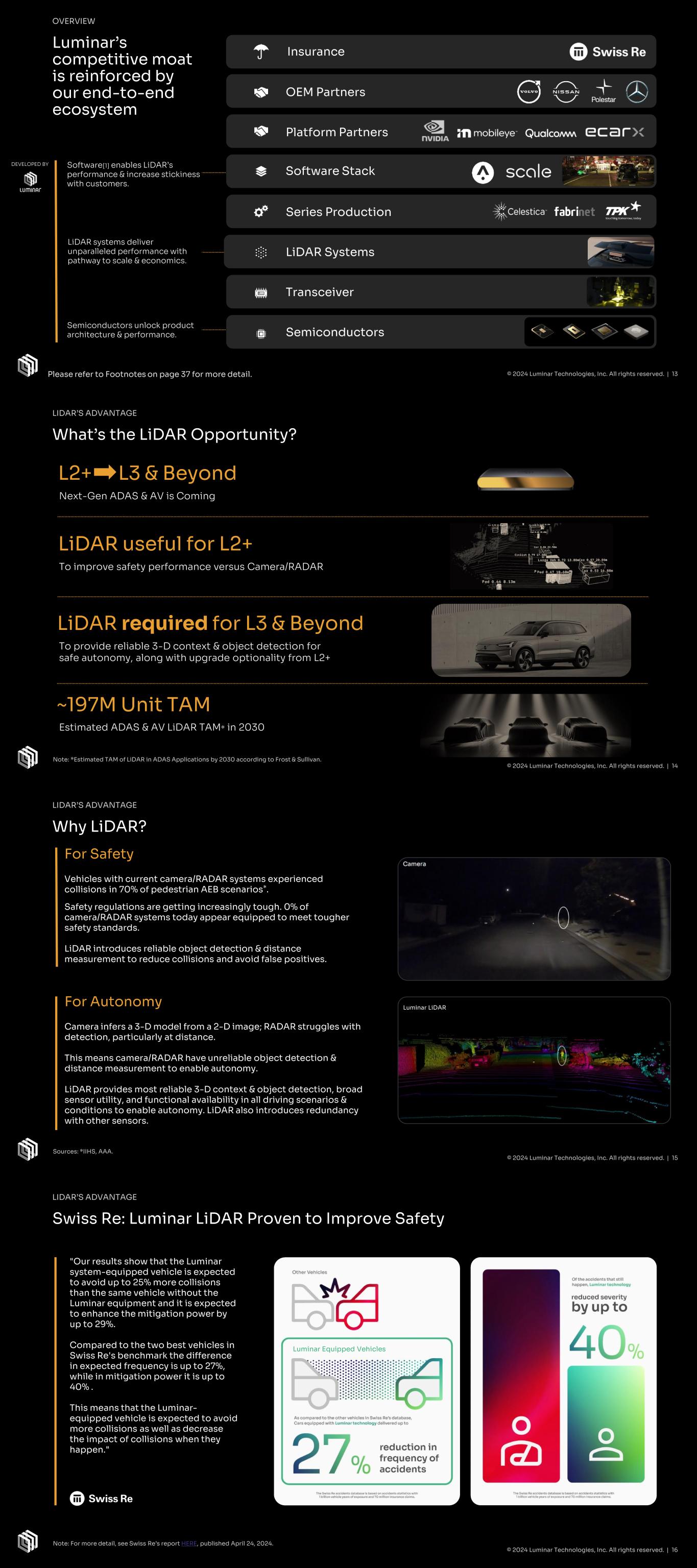 Transceiver LiDAR Systems Semiconductors Series Production Platform Partners OEM Partners Insurance Software Stack Luminar’s competitive moat is reinforced by our end-to-end ecosystem OVERVIEW Software[1] enables LiDAR’s performance & increase stickiness with customers. LiDAR systems deliver unparalleled performance with pathway to scale & economics. Semiconductors unlock product architecture & performance. DEVELOPED BY © 2024 Luminar Technologies, Inc. All rights reserved. | 13Please refer to Footnotes on page 37 for more detail. Next-Gen ADAS & AV is Coming L2+ L3 & Beyond To improve safety performance versus Camera/RADAR LiDAR useful for L2+ Estimated ADAS & AV LiDAR TAM* in 2030 ~197M Unit TAM © 2024 Luminar Technologies, Inc. All rights reserved. | 14 LIDAR’S ADVANTAGE What’s the LiDAR Opportunity? To provide reliable 3-D context & object detection for safe autonomy, along with upgrade optionality from L2+ LiDAR required for L3 & Beyond Note: *Estimated TAM of LiDAR in ADAS Applications by 2030 according to Frost & Sullivan. For Autonomy Camera infers a 3-D model from a 2-D image; RADAR struggles with detection, particularly at distance. This means camera/RADAR have unreliable object detection & distance measurement to enable autonomy. LiDAR provides most reliable 3-D context & object detection, broad sensor utility, and functional availability in all driving scenarios & conditions to enable autonomy. LiDAR also introduces redundancy with other sensors. For Safety Vehicles with current camera/RADAR systems experienced collisions in 70% of pedestrian AEB scenarios*. Safety regulations are getting increasingly tough. 0% of camera/RADAR systems today appear equipped to meet tougher safety standards. LiDAR introduces reliable object detection & distance measurement to reduce collisions and avoid false positives. LIDAR’S ADVANTAGE Why LiDAR? Luminar LiDAR Sources: *IIHS, AAA. © 2024 Luminar Technologies, Inc. All rights reserved. | 15 LIDAR’S ADVANTAGE Swiss Re: Luminar LiDAR Proven to Improve Safety © 2024 Luminar Technologies, Inc. All rights reserved. | 16 "Our results show that the Luminar system-equipped vehicle is expected to avoid up to 25% more collisions than the same vehicle without the Luminar equipment and it is expected to enhance the mitigation power by up to 29%. Compared to the two best vehicles in Swiss Re's benchmark the difference in expected frequency is up to 27%, while in mitigation power it is up to 40% . This means that the Luminar- equipped vehicle is expected to avoid more collisions as well as decrease the impact of collisions when they happen." Luminar Equipped Vehicles Note: For more detail, see Swiss Re’s report HERE, published April 24, 2024.