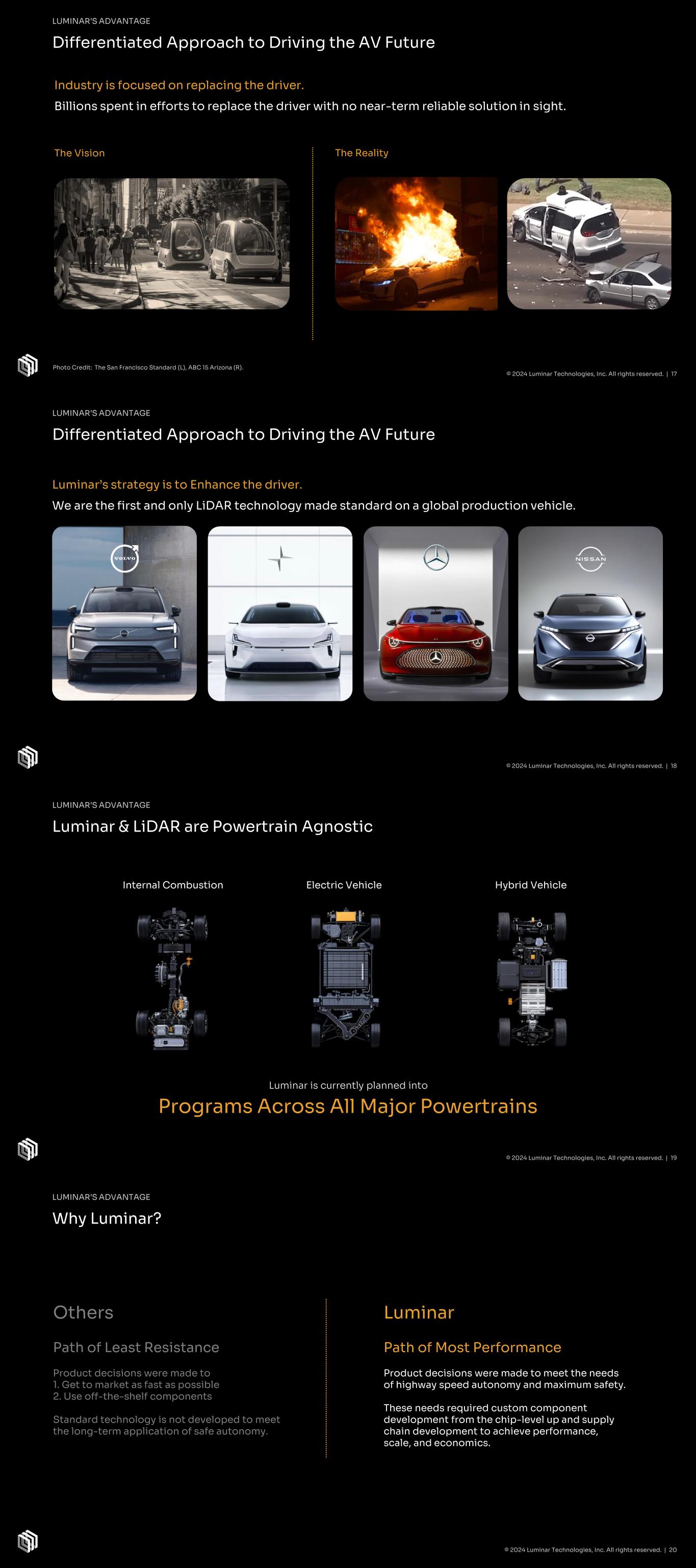© 2024 Luminar Technologies, Inc. All rights reserved. | 17 Industry is focused on replacing the driver. Billions spent in efforts to replace the driver with no near-term reliable solution in sight. The Vision The Reality Differentiated Approach to Driving the AV Future Photo Credit: The San Francisco Standard (L), ABC 15 Arizona (R). LUMINAR’S ADVANTAGE © 2024 Luminar Technologies, Inc. All rights reserved. | 18 Luminar’s strategy is to Enhance the driver. We are the first and only LiDAR technology made standard on a global production vehicle. Differentiated Approach to Driving the AV Future LUMINAR’S ADVANTAGE Hybrid VehicleInternal Combustion Electric Vehicle Luminar is currently planned into Programs Across All Major Powertrains © 2024 Luminar Technologies, Inc. All rights reserved. | 19 LUMINAR’S ADVANTAGE Luminar & LiDAR are Powertrain Agnostic © 2024 Luminar Technologies, Inc. All rights reserved. | 20 LUMINAR’S ADVANTAGE Why Luminar? Others Path of Least Resistance Product decisions were made to 1. Get to market as fast as possible 2. Use off-the-shelf components Standard technology is not developed to meet the long-term application of safe autonomy. Luminar Path of Most Performance Product decisions were made to meet the needs of highway speed autonomy and maximum safety. These needs required custom component development from the chip-level up and supply chain development to achieve performance, scale, and economics.