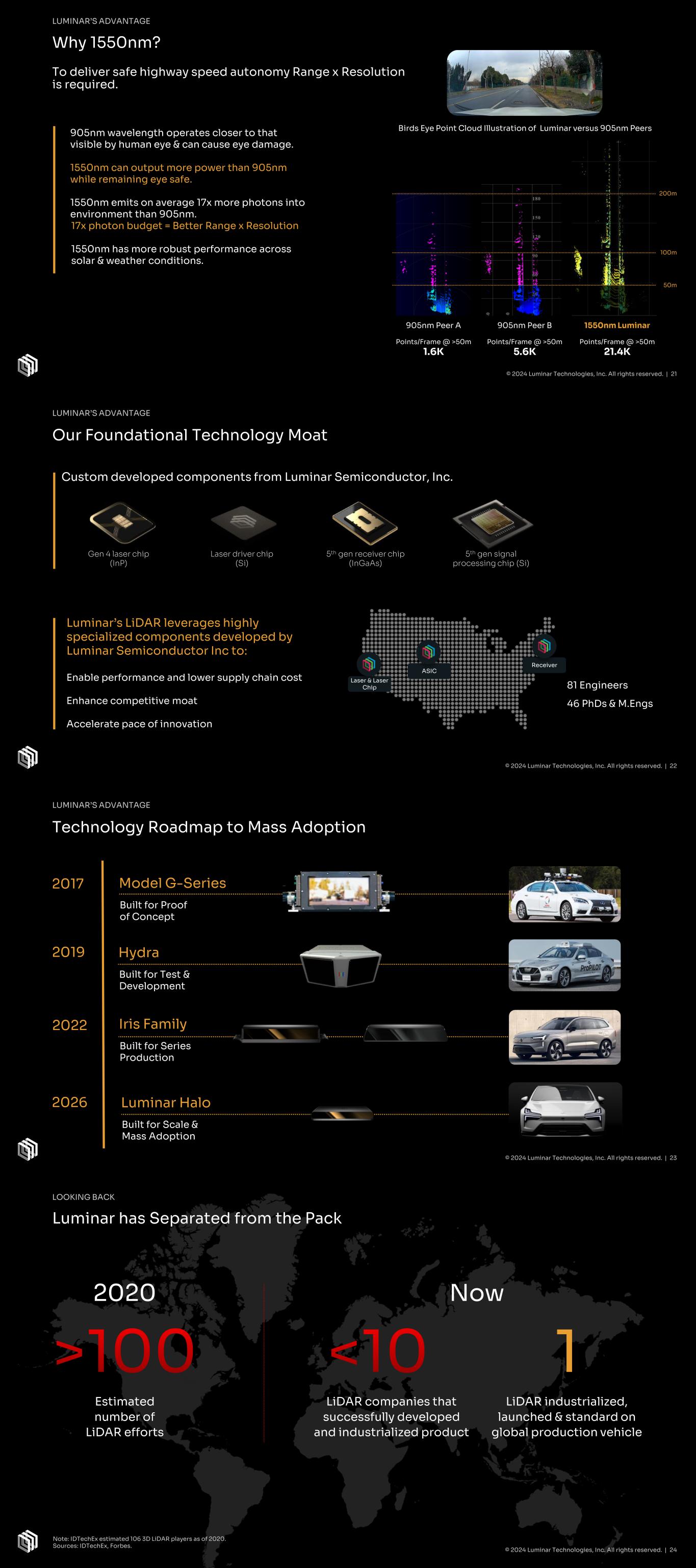 © 2024 Luminar Technologies, Inc. All rights reserved. | 21 LUMINAR’S ADVANTAGE Why 1550nm? To deliver safe highway speed autonomy Range x Resolution is required. 905nm wavelength operates closer to that visible by human eye & can cause eye damage. 1550nm can output more power than 905nm while remaining eye safe. 1550nm emits on average 17x more photons into environment than 905nm. 17x photon budget = Better Range x Resolution 1550nm has more robust performance across solar & weather conditions. 200m 100m 50m 905nm Peer A 905nm Peer B 1550nm Luminar Birds Eye Point Cloud Illustration of Luminar versus 905nm Peers Points/Frame @ >50m 1.6K Points/Frame @ >50m 5.6K Points/Frame @ >50m 21.4K © 2024 Luminar Technologies, Inc. All rights reserved. | 22 Our Foundational Technology Moat LUMINAR’S ADVANTAGE Laser & Laser Chip ASIC Receiver 81 Engineers 46 PhDs & M.Engs Gen 4 laser chip (InP) 5th gen receiver chip (InGaAs) Laser driver chip (Si) Custom developed components from Luminar Semiconductor, Inc. 5th gen signal processing chip (Si) Luminar’s LiDAR leverages highly specialized components developed by Luminar Semiconductor Inc to: Enable performance and lower supply chain cost Enhance competitive moat Accelerate pace of innovation © 2024 Luminar Technologies, Inc. All rights reserved. | 23 Iris Family Built for Series Production 2022 Luminar Halo Built for Scale & Mass Adoption 2026 Model G-Series Built for Proof of Concept 2017 Hydra Built for Test & Development 2019 Technology Roadmap to Mass Adoption LUMINAR’S ADVANTAGE © 2024 Luminar Technologies, Inc. All rights reserved. | 24 2020 Estimated number of LiDAR efforts >100 Now LiDAR companies that successfully developed and industrialized product <10 LiDAR industrialized, launched & standard on global production vehicle 1 Luminar has Separated from the Pack LOOKING BACK Note: IDTechEx estimated 106 3D LiDAR players as of 2020. Sources: IDTechEx, Forbes.
