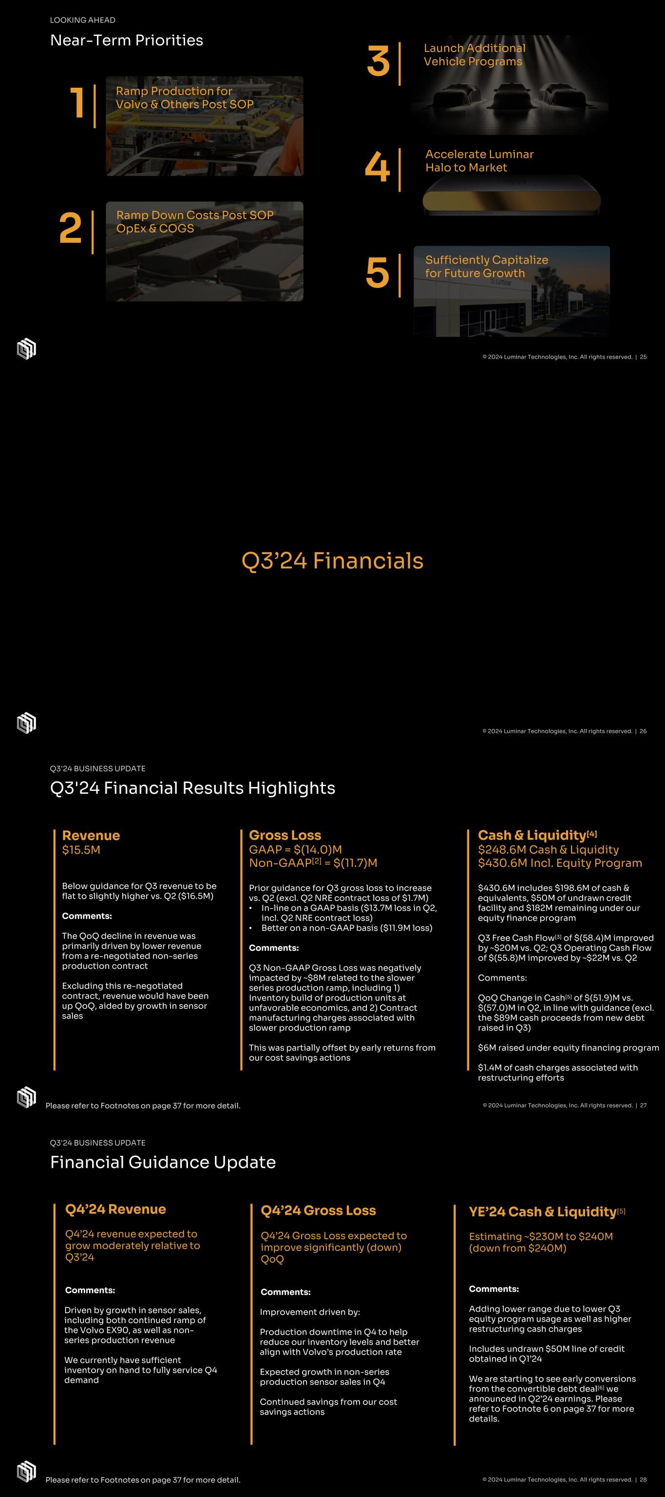 © 2024 Luminar Technologies, Inc. All rights reserved. | 25 Near-Term Priorities LOOKING AHEAD 1 2 3 4 Ramp Production for Volvo & Others Post SOP Ramp Down Costs Post SOP OpEx & COGS Launch Additional Vehicle Programs Accelerate Luminar Halo to Market 5 Sufficiently Capitalize for Future Growth © 2024 Luminar Technologies, Inc. All rights reserved. | 26 Q3’24 Financials © 2024 Luminar Technologies, Inc. All rights reserved. | 27 Q3'24 BUSINESS UPDATE Q3'24 Financial Results Highlights Revenue $15.5M Below guidance for Q3 revenue to be flat to slightly higher vs. Q2 ($16.5M) Comments: The QoQ decline in revenue was primarily driven by lower revenue from a re-negotiated non-series production contract Excluding this re-negotiated contract, revenue would have been up QoQ, aided by growth in sensor sales Gross Loss GAAP = $(14.0)M Non-GAAP[2] = $(11.7)M Prior guidance for Q3 gross loss to increase vs. Q2 (excl. Q2 NRE contract loss of $1.7M) • In-line on a GAAP basis ($13.7M loss in Q2, incl. Q2 NRE contract loss) • Better on a non-GAAP basis ($11.9M loss) Comments: Q3 Non-GAAP Gross Loss was negatively impacted by ~$8M related to the slower series production ramp, including 1) Inventory build of production units at unfavorable economics, and 2) Contract manufacturing charges associated with slower production ramp This was partially offset by early returns from our cost savings actions Cash & Liquidity[4] $248.6M Cash & Liquidity $430.6M Incl. Equity Program $430.6M includes $198.6M of cash & equivalents, $50M of undrawn credit facility and $182M remaining under our equity finance program Q3 Free Cash Flow[3] of $(58.4)M improved by ~$20M vs. Q2; Q3 Operating Cash Flow of $(55.8)M improved by ~$22M vs. Q2 Comments: QoQ Change in Cash[5] of $(51.9)M vs. $(57.0)M in Q2, in line with guidance (excl. the $89M cash proceeds from new debt raised in Q3) $6M raised under equity financing program $1.4M of cash charges associated with restructuring efforts Please refer to Footnotes on page 37 for more detail. © 2024 Luminar Technologies, Inc. All rights reserved. | 28 Q3'24 BUSINESS UPDATE Q4’24 Gross Loss Q4’24 Gross Loss expected to improve significantly (down) QoQ Comments: Improvement driven by: Production downtime in Q4 to help reduce our inventory levels and better align with Volvo’s production rate Expected growth in non-series production sensor sales in Q4 Continued savings from our cost savings actions YE’24 Cash & Liquidity[5] Estimating ~$230M to $240M (down from $240M) Comments: Adding lower range due to lower Q3 equity program usage as well as higher restructuring cash charges Includes undrawn $50M line of credit obtained in Q1’24 We are starting to see early conversions from the convertible debt deal[6] we announced in Q2’24 earnings. Please refer to Footnote 6 on page 37 for more details. Financial Guidance Update Q4’24 Revenue Q4’24 revenue expected to grow moderately relative to Q3’24 Comments: Driven by growth in sensor sales, including both continued ramp of the Volvo EX90, as well as non- series production revenue We currently have sufficient inventory on hand to fully service Q4 demand Please refer to Footnotes on page 37 for more detail.