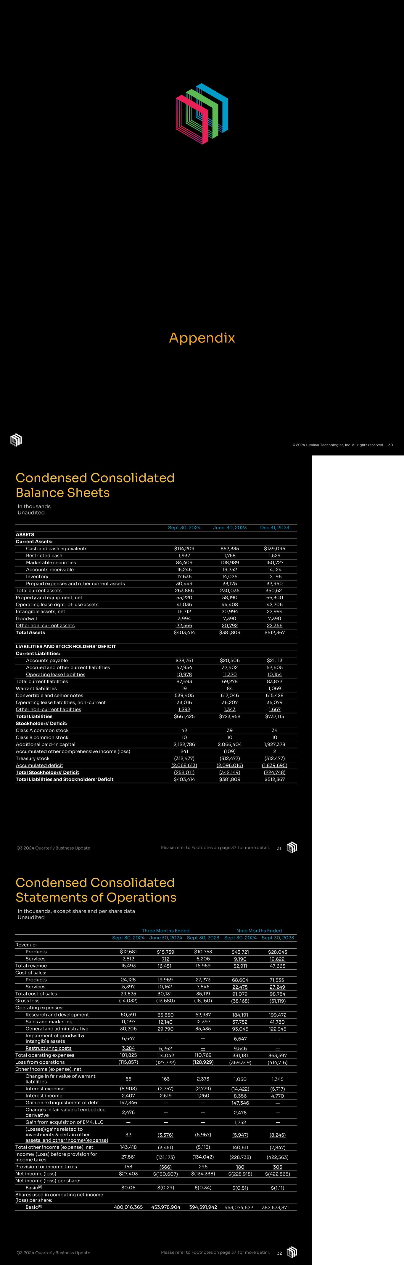 © 2024 Luminar Technologies, Inc. All rights reserved. | 30 Appendix Sept 30, 2024 June 30, 2023 Dec 31, 2023 ASSETS Current Assets: Cash and cash equivalents $114,209 $52,335 $139,095 Restricted cash 1,937 1,758 1,529 Marketable securities 84,409 108,989 150,727 Accounts receivable 15,246 19,752 14,124 Inventory 17,636 14,026 12,196 Prepaid expenses and other current assets 30,449 33,175 32,950 Total current assets 263,886 230,035 350,621 Property and equipment, net 55,220 58,190 66,300 Operating lease right-of-use assets 41,036 44,408 42,706 Intangible assets, net 16,712 20,994 22,994 Goodwill 3,994 7,390 7,390 Other non-current assets 22,566 20,792 22,356 Total Assets $403,414 $381,809 $512,367 LIABILITIES AND STOCKHOLDERS’ DEFICIT Current Liabilities: Accounts payable $28,761 $20,506 $21,113 Accrued and other current liabilities 47,954 37,402 52,605 Operating lease liabilities 10,978 11,370 10,154 Total current liabilities 87,693 69,278 83,872 Warrant liabilities 19 84 1,069 Convertible and senior notes 539,405 617,046 615,428 Operating lease liabilities, non-current 33,016 36,207 35,079 Other non-current liabilities 1,292 1,343 1,667 Total Liabilities $661,425 $723,958 $737,115 Stockholders’ Deficit: Class A common stock 42 39 34 Class B common stock 10 10 10 Additional paid-in capital 2,122,786 2,066,404 1,927,378 Accumulated other comprehensive income (loss) 241 (109) 2 Treasury stock (312,477) (312,477) (312,477) Accumulated deficit (2,068,613) (2,096,016) (1,839,695) Total Stockholders’ Deficit (258,011) (342,149) (224,748) Total Liabilities and Stockholders’ Deficit $403,414 $381,809 $512,367 Condensed Consolidated Balance Sheets In thousands Unaudited 31Q3 2024 Quarterly Business Update Please refer to Footnotes on page 37 for more detail. Three Months Ended Nine Months Ended Sept 30, 2024 June 30, 2024 Sept 30, 2023 Sept 30, 2024 Sept 30, 2023 Revenue: Products $12,681 $15,739 $10,753 $43,721 $28,043 Services 2,812 712 6,206 9,190 19,622 Total revenue 15,493 16,451 16,959 52,911 47,665 Cost of sales: Products 24,128 19,969 27,273 68,604 71,535 Services 5,397 10,162 7,846 22,475 27,249 Total cost of sales 29,525 30,131 35,119 91,079 98,784 Gross loss (14,032) (13,680) (18,160) (38,168) (51,119) Operating expenses: Research and development 50,591 65,850 62,937 184,191 199,472 Sales and marketing 11,097 12,140 12,397 37,752 41,780 General and administrative 30,206 29,790 35,435 93,045 122,345 Impairment of goodwill & intangible assets 6,647 — — 6,647 — Restructuring costs 3,284 6,262 — 9,546 — Total operating expenses 101,825 114,042 110,769 331,181 363,597 Loss from operations (115,857) (127,722) (128,929) (369,349) (414,716) Other income (expense), net: Change in fair value of warrant liabilities 65 163 2,373 1,050 1,345 Interest expense (8,908) (2,757) (2,779) (14,422) (5,717) Interest income 2,407 2,519 1,260 8,356 4,770 Gain on extinguishment of debt 147,346 — — 147,346 — Changes in fair value of embedded derivative 2,476 — — 2,476 — Gain from acquisition of EM4, LLC — — — 1,752 — (Losses)/gains related to investments & certain other assets, and other income/(expense) 32 (3,376) (5,967) (5,947) (8,245) Total other income (expense), net 143,418 (3,451) (5,113) 140,611 (7,847) Income/ (Loss) before provision for income taxes 27,561 (131,173) (134,042) (228,738) (422,563) Provision for income taxes 158 (566) 296 180 305 Net income (loss) $27,403 $(130,607) $(134,338) $(228,918) $(422,868) Net income (loss) per share: Basic[8] $0.06 $(0.29) $(0.34) $(0.51) $(1.11) Shares used in computing net income (loss) per share: Basic[8] 480,016,365 453,978,904 394,591,942 453,074,622 382,673,871 Condensed Consolidated Statements of Operations In thousands, except share and per share data Unaudited 32Q3 2024 Quarterly Business Update Please refer to Footnotes on page 37 for more detail.