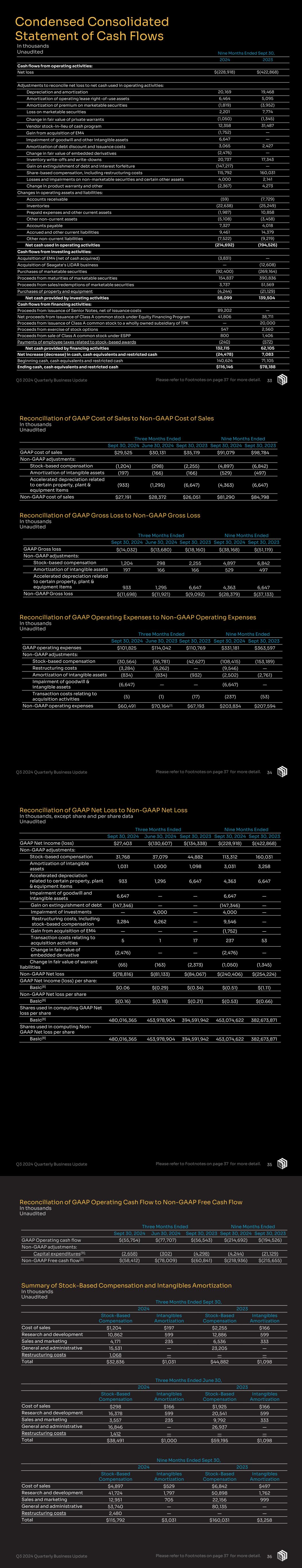 Nine Months Ended Sept 30, 2024 2023 Cash flows from operating activities: Net loss $(228,918) $(422,868) Adjustments to reconcile net loss to net cash used in operating activities: Depreciation and amortization 20,169 19,468 Amortization of operating lease right-of-use assets 6,464 5,095 Amortization of premium on marketable securities (1,819) (3,952) Loss on marketable securities 2,201 7,774 Change in fair value of private warrants (1,050) (1,345) Vendor stock-in-lieu of cash program 12,358 31,487 Gain from acquisition of EM4 (1,752) — Impairment of goodwill and other intangible assets 6,647 — Amortization of debt discount and issuance costs 3,065 2,427 Change in fair value of embedded derivatives (2,476) — Inventory write-offs and write-downs 20,737 17,343 Gain on extinguishment of debt and interest forfeiture (147,217) — Share-based compensation, including restructuring costs 115,792 160,031 Losses and impairments on non-marketable securities and certain other assets 4,000 2,141 Change in product warranty and other (2,367) 4,273 Changes in operating assets and liabilities: Accounts receivable (59) (7,729) Inventories (22,638) (25,249) Prepaid expenses and other current assets (1,987) 10,858 Other non-current assets (5,108) (3,458) Accounts payable 7,327 4,018 Accrued and other current liabilities 9,461 14,379 Other non-current liabilities (7,522) (9,219) Net cash used in operating activities (214,692) (194,526) Cash flows from investing activities: Acquisition of EM4 (net of cash acquired) (3,831) — Acquisition of Seagate's LiDAR business — (12,608) Purchases of marketable securities (92,400) (269,164) Proceeds from maturities of marketable securities 154,837 390,836 Proceeds from sales/redemptions of marketable securities 3,737 51,569 Purchases of property and equipment (4,244) (21,129) Net cash provided by investing activities 58,099 139,504 Cash flows from financing activities: Proceeds from issuance of Senior Notes, net of issuance costs 89,202 — Net proceeds from issuance of Class A common stock under Equity Financing Program 41,806 38,711 Proceeds from issuance of Class A common stock to a wholly owned subsidiary of TPK — 20,000 Proceeds from exercise of stock options 547 2,560 Proceeds from sale of Class A common stock under ESPP 800 1,406 Payments of employee taxes related to stock-based awards (240) (572) Net cash provided by financing activities 132,115 62,105 Net increase (decrease) in cash, cash equivalents and restricted cash (24,478) 7,083 Beginning cash, cash equivalents and restricted cash 140,624 71,105 Ending cash, cash equivalents and restricted cash $116,146 $78,188 Condensed Consolidated Statement of Cash Flows In thousands Unaudited 33Q3 2024 Quarterly Business Update Please refer to Footnotes on page 37 for more detail. Three Months Ended Nine Months Ended Sept 30, 2024 June 30, 2024 Sept 30, 2023 Sept 30, 2024 Sept 30, 2023 GAAP Gross loss $(14,032) $(13,680) $(18,160) $(38,168) $(51,119) Non-GAAP adjustments: Stock-based compensation 1,204 298 2,255 4,897 6,842 Amortization of intangible assets 197 166 166 529 497 Accelerated depreciation related to certain property, plant & equipment items 933 1,295 6,647 4,363 6,647 Non-GAAP Gross loss $(11,698) $(11,921) $(9,092) $(28,379) $(37,133) Reconciliation of GAAP Cost of Sales to Non-GAAP Cost of Sales In thousands Unaudited Reconciliation of GAAP Gross Loss to Non-GAAP Gross Loss In thousands Unaudited Three Months Ended Nine Months Ended Sept 30, 2024 June 30, 2023 Sept 30, 2023 Sept 30, 2024 Sept 30, 2023 GAAP operating expenses $101,825 $114,042 $110,769 $331,181 $363,597 Non-GAAP adjustments: Stock-based compensation (30,564) (36,781) (42,627) (108,415) (153,189) Restructuring costs (3,284) (6,262) — (9,546) — Amortization of intangible assets (834) (834) (932) (2,502) (2,761) Impairment of goodwill & intangible assets (6,647) — — (6,647) — Transaction costs relating to acquisition activities (5) (1) (17) (237) (53) Non-GAAP operating expenses $60,491 $70,164[7] $67,193 $203,834 $207,594 Reconciliation of GAAP Operating Expenses to Non-GAAP Operating Expenses In thousands Unaudited 34Q3 2024 Quarterly Business Update Three Months Ended Nine Months Ended Sept 30, 2024 June 30, 2024 Sept 30, 2023 Sept 30, 2024 Sept 30, 2023 GAAP cost of sales $29,525 $30,131 $35,119 $91,079 $98,784 Non-GAAP adjustments: Stock-based compensation (1,204) (298) (2,255) (4,897) (6,842) Amortization of intangible assets (197) (166) (166) (529) (497) Accelerated depreciation related to certain property, plant & equipment items (933) (1,295) (6,647) (4,363) (6,647) Non-GAAP cost of sales $27,191 $28,372 $26,051 $81,290 $84,798 Please refer to Footnotes on page 37 for more detail. Three Months Ended Nine Months Ended Sept 30, 2024 June 30, 2024 Sept 30, 2023 Sept 30, 2024 Sept 30, 2023 GAAP Net income (loss) $27,403 $(130,607) $(134,338) $(228,918) $(422,868) Non-GAAP adjustments: Stock-based compensation 31,768 37,079 44,882 113,312 160,031 Amortization of intangible assets 1,031 1,000 1,098 3,031 3,258 Accelerated depreciation related to certain property, plant & equipment items 933 1,295 6,647 4,363 6,647 Impairment of goodwill and intangible assets 6,647 — — 6,647 — Gain on extinguishment of debt (147,346) — — (147,346) — Impairment of investments — 4,000 — 4,000 — Restructuring costs, including stock-based compensation 3,284 6,262 — 9,546 — Gain from acquisition of EM4 — — — (1,752) — Transaction costs relating to acquisition activities 5 1 17 237 53 Change in fair value of embedded derivative (2,476) — — (2,476) — Change in fair value of warrant liabilities (65) (163) (2,373) (1,050) (1,345) Non-GAAP Net loss $(78,816) $(81,133) $(84,067) $(240,406) $(254,224) GAAP Net income (loss) per share: Basic[8] $0.06 $(0.29) $(0.34) $(0.51) $(1.11) Non-GAAP Net loss per share Basic[8] $(0.16) $(0.18) $(0.21) $(0.53) $(0.66) Shares used in computing GAAP Net loss per share Basic