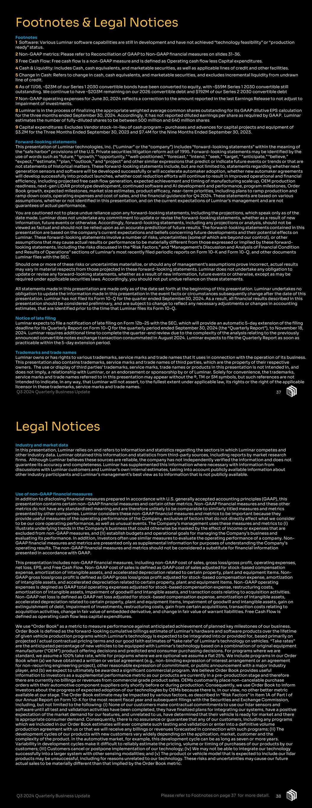 Footnotes & Legal Notices Footnotes 1 Software: Various Luminar software capabilities are still in development and have not achieved “technology feasibility” or “production ready” status. 2 Non-GAAP metrics: Please refer to Reconciliation of GAAP to Non-GAAP financial measures on slides 31-36. 3 Free Cash Flow: Free cash flow is a non-GAAP measure and is defined as Operating cash flow less Capital expenditures. 4 Cash & Liquidity: Includes Cash, cash equivalents, and marketable securities, as well as applicable lines of credit and other facilities. 5 Change in Cash: Refers to change in cash, cash equivalents, and marketable securities, and excludes incremental liquidity from undrawn line of credit. 6 As of 11/08, ~$23M of our Series 1 2030 convertible bonds have been converted to equity, with ~$59M Series 1 2030 convertible still outstanding. We continue to have ~$203M remaining on our 2026 convertible debt and $192M of our Series 2 2030 convertible debt 7 Non-GAAP operating expenses for June 30, 2024 reflects a correction to the amount reported in the last Earnings Release to not adjust to Impairment of investments. 8 Luminar is in the process of finalizing the appropriate weighted average common shares outstanding for its GAAP dilutive EPS calculation for the three months ended September 30, 2024. Accordingly, it has not reported diluted earnings per share as required by GAAP. Luminar estimates the number of fully-diluted shares to be between 500 million and 640 million shares 9 Capital expenditures: Excludes Vendor stock-in-lieu of cash program - purchases and advances for capital projects and equipment of $3.2M for the Three Months Ended September 30, 2023 and $7.4M for the Nine Months Ended September 30, 2023. Forward-looking statements This presentation of Luminar technologies, inc. (“Luminar” or the “company”) includes “forward-looking statements” within the meaning of the “safe harbor” provisions of the U.S. Private securities litigation reform act of 1995. Forward-looking statements may be identified by the use of words such as “future,” “growth,” “opportunity,” “well-positioned,” "forecast," "intend," "seek," "target," “anticipate,” “believe,” “expect,” “estimate,” “plan,” “outlook,” and “project” and other similar expressions that predict or indicate future events or trends or that are not statements of historical matters. These forward-looking statements include, but are not limited to, statements regarding whether next generation sensors and software will be developed successfully or will accelerate automaker adoption, whether new automaker agreements will develop successfully into product launches, whether cost reduction efforts will continue to result in improved operational and financial efficiency, including projected free cash flow generation, expected achievement and timing of manufacturing scale up, OEM production readiness, next-gen LiDAR prototype development, continued software and AI development and performance, program milestones, Order Book growth, expected milestones, market size estimates, product efficacy, near-term priorities, including plans to ramp production and ramp down costs, operating expenses and cost of sales, and the financial guidance for Q4 2024. These statements are based on various assumptions, whether or not identified in this presentation, and on the current expectations of Luminar’s management and are not guarantees of actual performance. You are cautioned not to place undue reliance upon any forward-looking statements, including the projections, which speak only as of the date made. Luminar does not undertake any commitment to update or revise the forward-looking statements, whether as a result of new information, future events or otherwise. Accordingly, forward-looking statements, including any projections or analysis, should not be viewed as factual and should not be relied upon as an accurate prediction of future results. The forward-looking statements contained in this presentation are based on the company’s current expectations and beliefs concerning future developments and their potential effects on Luminar. These forward-looking statements involve a number of risks, uncertainties (some of which are beyond our control), or other assumptions that may cause actual results or performance to be materially different from those expressed or implied by these forward- looking statements, including the risks discussed in the “Risk Factors,” and “Management’s Discussion and Analysis of Financial Condition and Results of Operations” sections of Luminar’s most recently filed periodic reports on Form 10-K and Form 10-Q, and other documents Luminar files with the SEC. Should one or more of these risks or uncertainties materialize, or should any of management’s assumptions prove incorrect, actual results may vary in material respects from those projected in these forward-looking statements. Luminar does not undertake any obligation to update or revise any forward-looking statements, whether as a result of new information, future events or otherwise, except as may be required under applicable securities laws. Accordingly, you should not put undue reliance on these statements. All statements made in this presentation are made only as of the date set forth at the beginning of this presentation. Luminar undertakes no obligation to update the information made in this presentation in the event facts or circumstances subsequently change after the date of this presentation. Luminar has not filed its Form 10-Q for the quarter ended September30, 2024. As a result, all financial results described in this presentation should be considered preliminary, and are subject to change to reflect any necessary adjustments or changes in accounting estimates, that are identified prior to the time that Luminar files its Form 10-Q. Notice of late filing Luminar expects to file a notificati