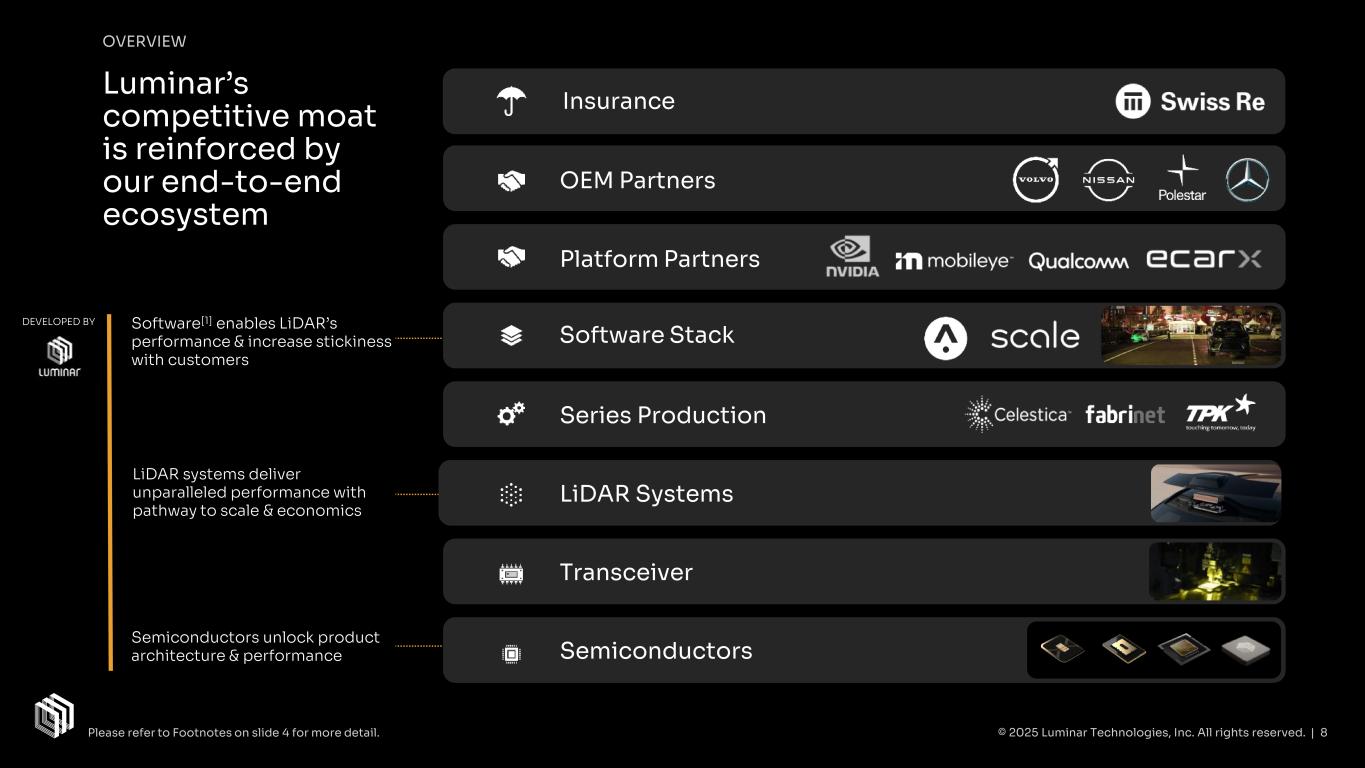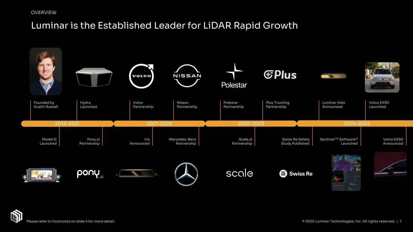 OVERVIEW Luminar is the Established Leader for LiDAR Rapid Growth 2012-2021 2021-2022 2022-2023 2024-2025 Swiss Re Safety Study Published Luminar Halo Announced Volvo EX90 Launched Plus Trucking Partnership Founded by Austin Russell Pony.ai Partnership Hydra Launched Volvo Partnership Nissan Partnership Model G Launched Scale.ai Partnership Sentinel TM Software[1] Launched Mercedes-Benz Partnership Iris Announced © 2025 Luminar Technologies, Inc. All rights reserved. | 7 Polestar Partnership Volvo ES90 Announced Please refer to Footnotes on slide 4 for more detail.