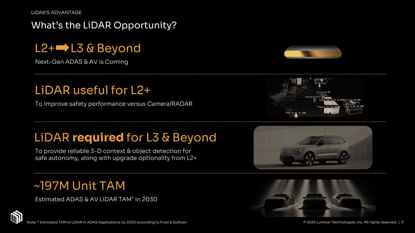 Transceiver LiDAR Systems Semiconductors Series Production Platform Partners OEM Partners Insurance Software Stack Luminar’s competitive moat is reinforced by our end-to-end ecosystem OVERVIEW Software[1] enables LiDAR’s performance & increase stickiness with customers LiDAR systems deliver unparalleled performance with pathway to scale & economics Semiconductors unlock product architecture & performance DEVELOPED BY © 2025 Luminar Technologies, Inc. All rights reserved. | 8Please refer to Footnotes on slide 4 for more detail.