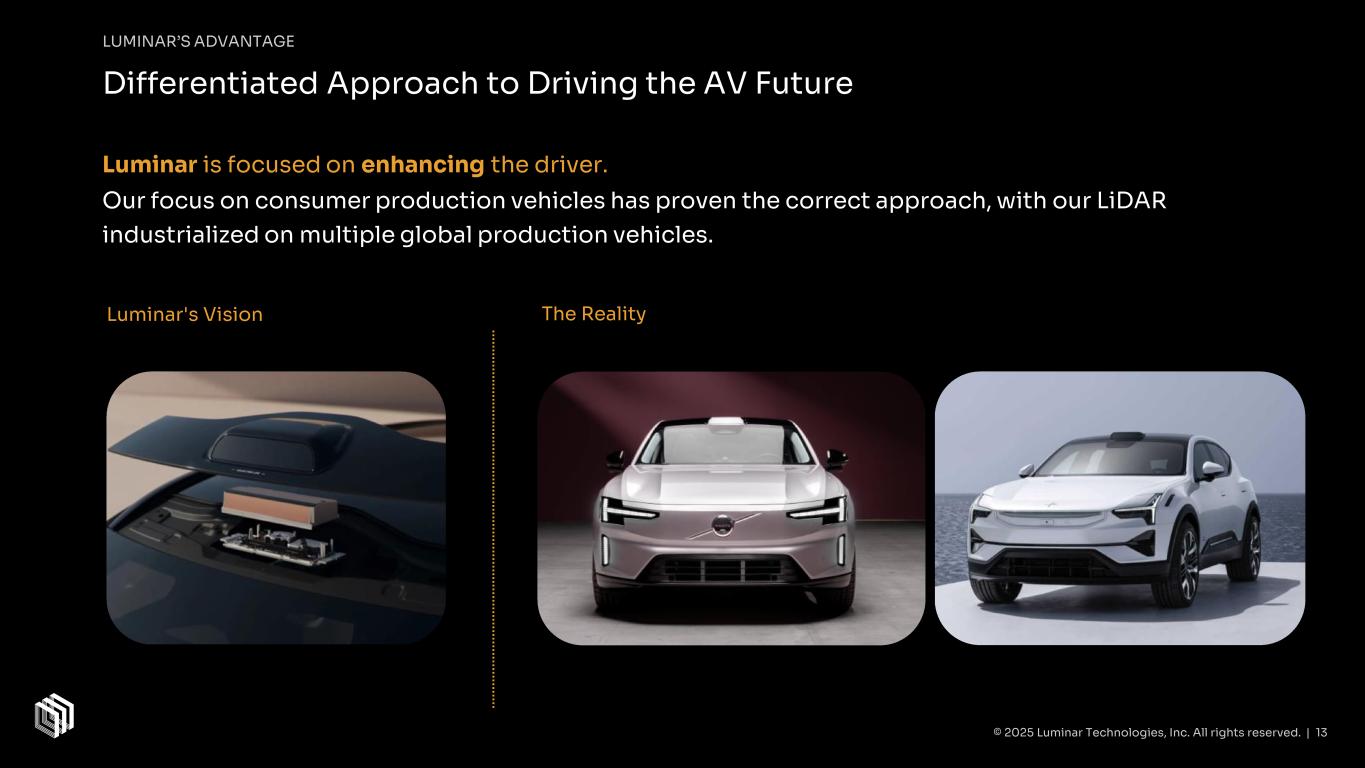 Industry is focused on replacing the driver. Billions spent in efforts to replace the driver with no near-term reliable solution in sight. The Vision The Reality Differentiated Approach to Driving the AV Future LUMINAR’S ADVANTAGE © 2025 Luminar Technologies, Inc. All rights reserved. | 12Photo Credit: Under Reality, Forbes (L) ABC 15 Arizona (R).