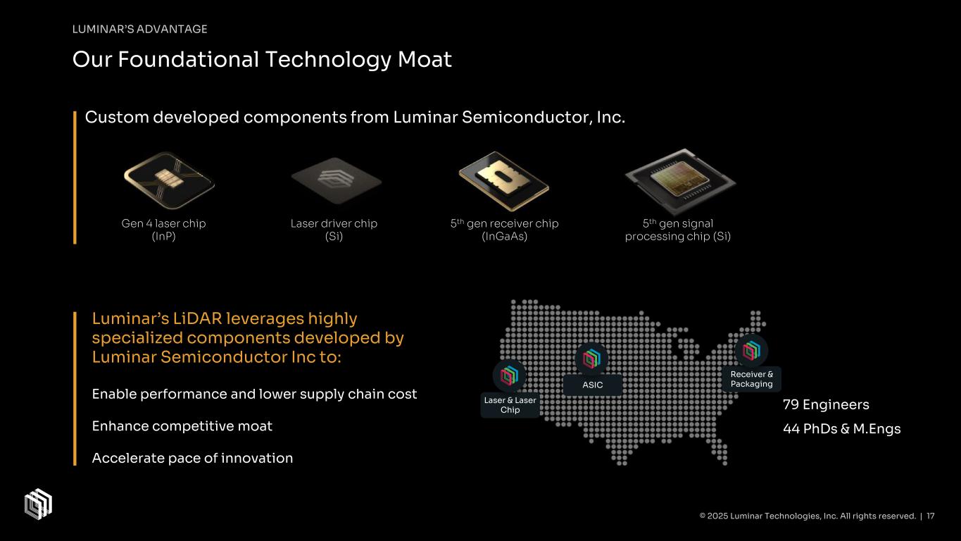 LUMINAR’S ADVANTAGE Why 1550nm? To deliver safe highway speed autonomy, Range x Resolution is required. 905nm wavelength operates closer to that visible by human eye & can cause eye damage. 1550nm can output more power than 905nm while remaining eye safe. 1550nm emits on average 17x more photons into environment than 905nm. 17x photon budget = Better Range x Resolution 1550nm has more robust performance across solar & weather conditions. 200m 100m 50m 905nm Peer A 905nm Peer B 1550nm Luminar Birds Eye Point Cloud Illustration of Luminar versus 905nm Peers Points/Frame @ >50m 1.6K Points/Frame @ >50m 5.6K Points/Frame @ >50m 21.4K © 2025 Luminar Technologies, Inc. All rights reserved. | 16