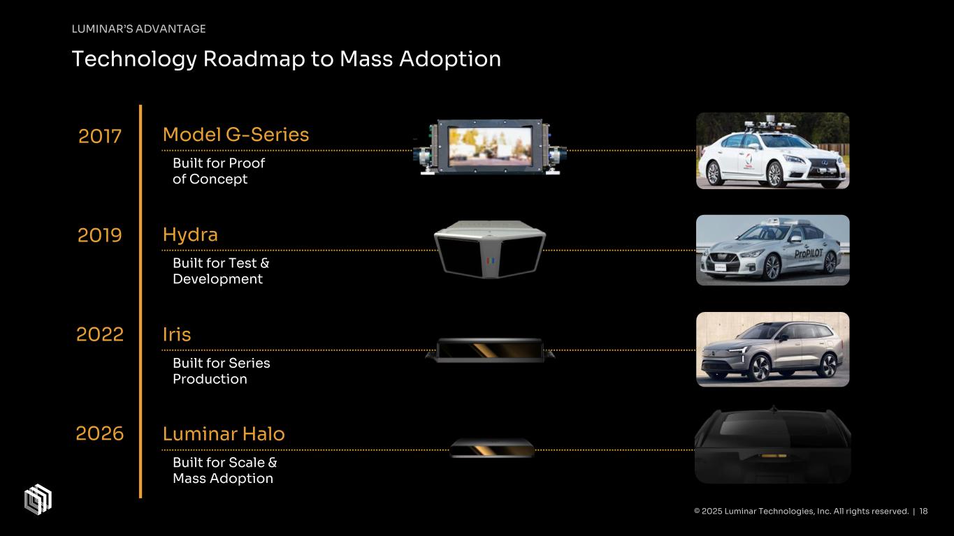 Our Foundational Technology Moat LUMINAR’S ADVANTAGE Laser & Laser Chip ASIC Receiver & Packaging 79 Engineers 44 PhDs & M.Engs Gen 4 laser chip (InP) 5th gen receiver chip (InGaAs) Laser driver chip (Si) Custom developed components from Luminar Semiconductor, Inc. 5th gen signal processing chip (Si) Luminar’s LiDAR leverages highly specialized components developed by Luminar Semiconductor Inc to: Enable performance and lower supply chain cost Enhance competitive moat Accelerate pace of innovation © 2025 Luminar Technologies, Inc. All rights reserved. | 17