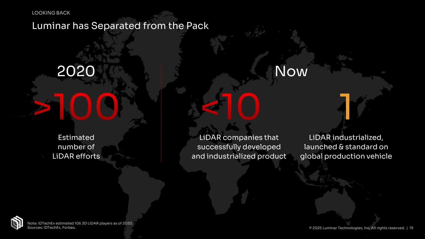2020 Estimated number of LiDAR efforts >100 Now LiDAR companies that successfully developed and industrialized product <10 LiDAR industrialized, launched & standard on global production vehicle 1 Luminar has Separated from the Pack LOOKING BACK © 2025 Luminar Technologies, Inc. All rights reserved. | 19 Note: IDTechEx estimated 106 3D LiDAR players as of 2020. Sources: IDTechEx, Forbes.