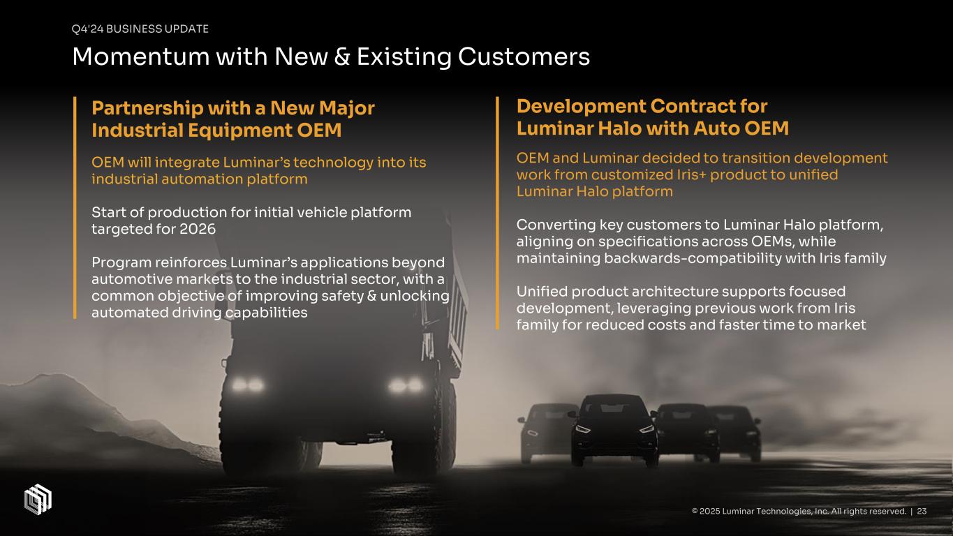 Q4'24 BUSINESS UPDATE As prefaced at Q3’24 Earnings, Luminar was selected to be featured on an additional vehicle model in Volvo Cars’ line-up – the Volvo ES90 Luminar’s LiDAR will be similarly integrated into the roofline of the ES90 ES90 is slated for production in late 2025, and follows the successful launch and delivery of the EX90 in 2024 Continued expansion of the partnership demonstrates Volvo Cars’ commitment to automotive safety, as well as Luminar’s leadership in the LiDAR space and ability to industrialize at scale © 2025 Luminar Technologies, Inc. All rights reserved. | 22 Luminar Technology Selected for Volvo ES90 Follows Successful Launch & Delivery of Volvo EX90
