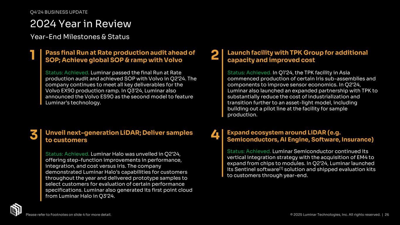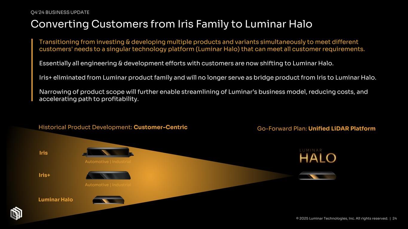 Q4'24 BUSINESS UPDATE Momentum with New & Existing Customers OEM will integrate Luminar’s technology into its industrial automation platform Start of production for initial vehicle platform targeted for 2026 Program reinforces Luminar’s applications beyond automotive markets to the industrial sector, with a common objective of improving safety & unlocking automated driving capabilities OEM and Luminar decided to transition development work from customized Iris+ product to unified Luminar Halo platform Converting key customers to Luminar Halo platform, aligning on specifications across OEMs, while maintaining backwards-compatibility with Iris family Unified product architecture supports focused development, leveraging previous work from Iris family for reduced costs and faster time to market Partnership with a New Major Industrial Equipment OEM Development Contract for Luminar Halo with Auto OEM © 2025 Luminar Technologies, Inc. All rights reserved. | 23