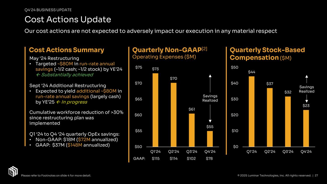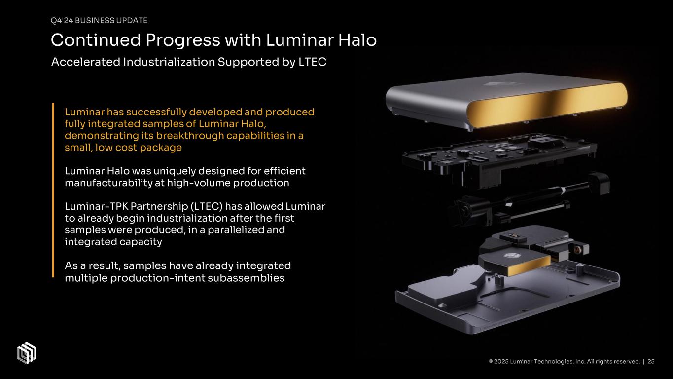© 2025 Luminar Technologies, Inc. All rights reserved. | 24 Q4'24 BUSINESS UPDATE Converting Customers from Iris Family to Luminar Halo Transitioning from investing & developing multiple products and variants simultaneously to meet different customers' needs to a singular technology platform (Luminar Halo) that can meet all customer requirements. Essentially all engineering & development efforts with customers are now shifting to Luminar Halo. Iris+ eliminated from Luminar product family and will no longer serve as bridge product from Iris to Luminar Halo. Narrowing of product scope will further enable streamlining of Luminar’s business model, reducing costs, and accelerating path to profitability. Iris Iris+ Automotive | Industrial Luminar Halo Historical Product Development: Customer-Centric Go-Forward Plan: Unified LiDAR Platform Automotive | Industrial