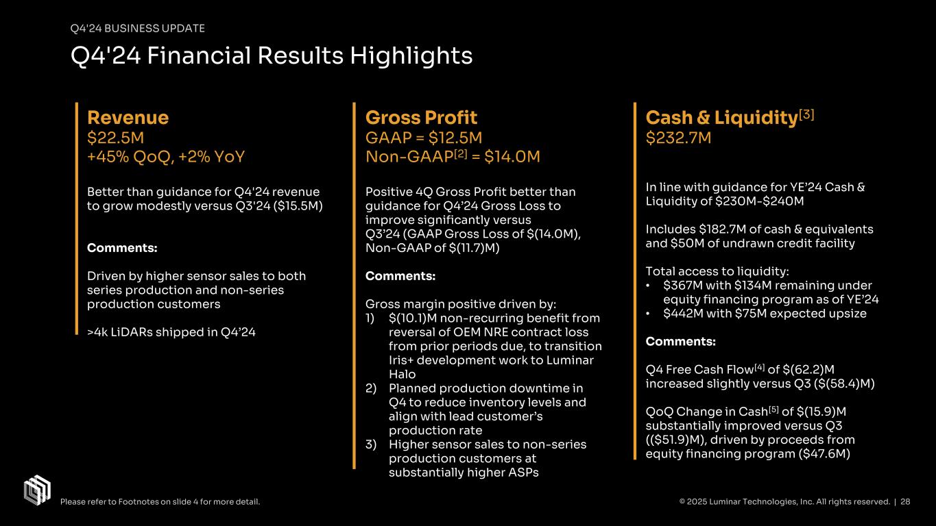 $73 $70 $61 $55 $50 $55 $60 $65 $70 $75 Q1'24 Q2'24 Q3'24 Q4'24 Q4'24 BUSINESS UPDATE Cost Actions Update May ‘24 Restructuring • Targeted ~$80M in run-rate annual savings (~1/2 cash; ~1/2 stock) by YE’24  Substantially achieved Sept ‘24 Additional Restructuring • Expected to yield additional ~$80M in run-rate annual savings (largely cash) by YE’25  In progress Cumulative workforce reduction of >30% since restructuring plan was implemented Q1 ‘24 to Q4 ‘24 quarterly OpEx savings: • Non-GAAP: $18M ($72M annualized) • GAAP: $37M ($148M annualized) Cost Actions Summary Our cost actions are not expected to adversely impact our execution in any material respect Quarterly Non-GAAP[2] Operating Expenses ($M) Quarterly Stock-Based Compensation ($M) Savings Realized © 2025 Luminar Technologies, Inc. All rights reserved. | 27 GAAP: $115 $114 $102 $78 $44 $37 $32 $23 $0 $10 $20 $30 $40 $50 Q1'24 Q2'24 Q3'24 Q4'24 Savings Realized Please refer to Footnotes on slide 4 for more detail.