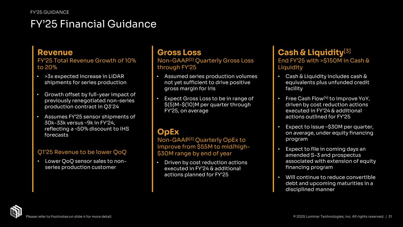 FY’25 GUIDANCE 2025 Year Ahead Ramp series production volume at least 3x year-over-year; Drive economies of scale; Launch additional vehicle models Progress on Luminar Halo milestones in customer development contracts for SOP Streamline Luminar’s operations with customer transitions to a singular technology platform (Luminar Halo) to drive efficient execution, reduced costs, and accelerated path to profitability Series Production Next-Generation Technology Business Model © 2025 Luminar Technologies, Inc. All rights reserved. | 30 Year-End Milestones Please refer to Footnotes on slide 4 for more detail. 1 2 3