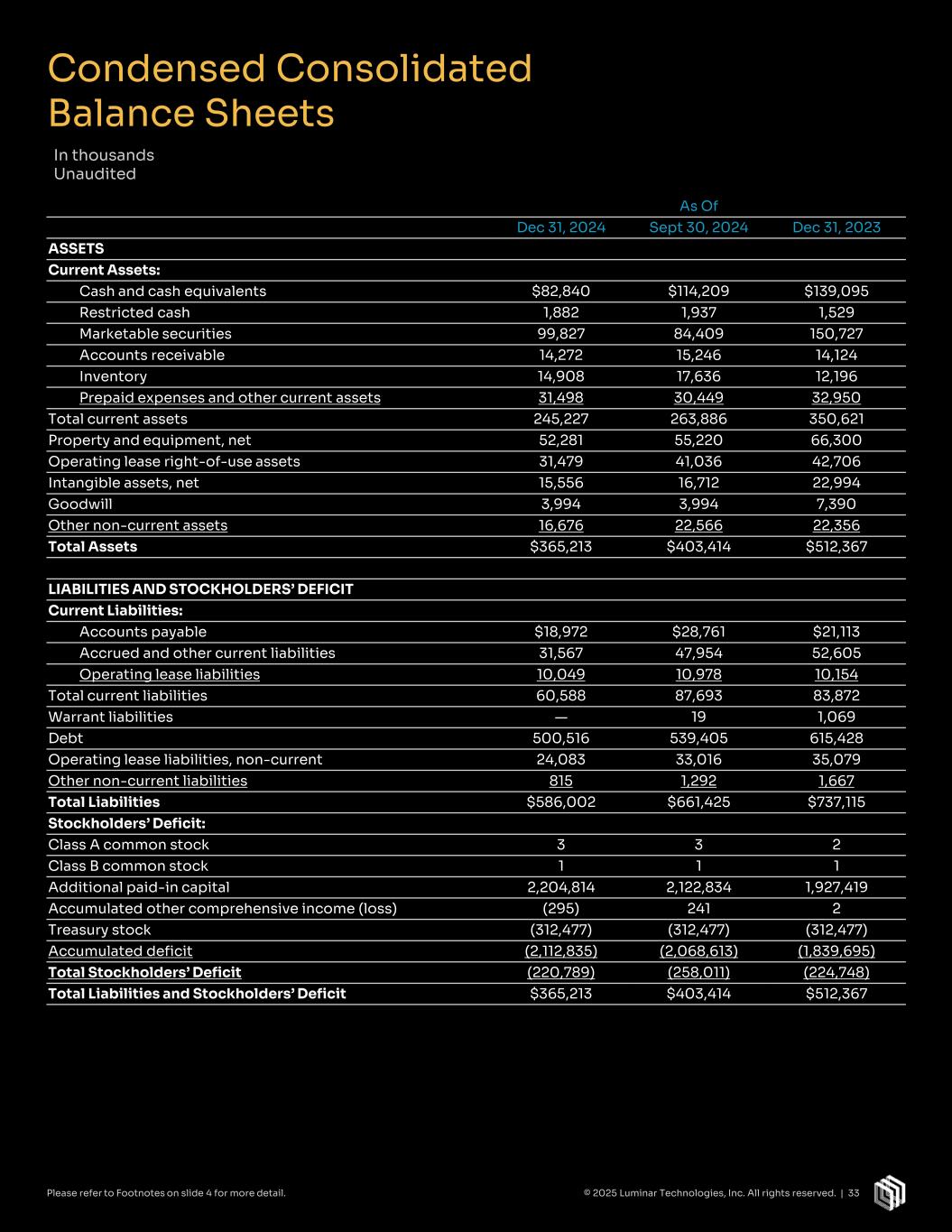 As Of Dec 31, 2024 Sept 30, 2024 Dec 31, 2023 ASSETS Current Assets: Cash and cash equivalents $82,840 $114,209 $139,095 Restricted cash 1,882 1,937 1,529 Marketable securities 99,827 84,409 150,727 Accounts receivable 14,272 15,246 14,124 Inventory 14,908 17,636 12,196 Prepaid expenses and other current assets 31,498 30,449 32,950 Total current assets 245,227 263,886 350,621 Property and equipment, net 52,281 55,220 66,300 Operating lease right-of-use assets 31,479 41,036 42,706 Intangible assets, net 15,556 16,712 22,994 Goodwill 3,994 3,994 7,390 Other non-current assets 16,676 22,566 22,356 Total Assets $365,213 $403,414 $512,367 LIABILITIES AND STOCKHOLDERS’ DEFICIT Current Liabilities: Accounts payable $18,972 $28,761 $21,113 Accrued and other current liabilities 31,567 47,954 52,605 Operating lease liabilities 10,049 10,978 10,154 Total current liabilities 60,588 87,693 83,872 Warrant liabilities — 19 1,069 Debt 500,516 539,405 615,428 Operating lease liabilities, non-current 24,083 33,016 35,079 Other non-current liabilities 815 1,292 1,667 Total Liabilities $586,002 $661,425 $737,115 Stockholders’ Deficit: Class A common stock 3 3 2 Class B common stock 1 1 1 Additional paid-in capital 2,204,814 2,122,834 1,927,419 Accumulated other comprehensive income (loss) (295) 241 2 Treasury stock (312,477) (312,477) (312,477) Accumulated deficit (2,112,835) (2,068,613) (1,839,695) Total Stockholders’ Deficit (220,789) (258,011) (224,748) Total Liabilities and Stockholders’ Deficit $365,213 $403,414 $512,367 Condensed Consolidated Balance Sheets In thousands Unaudited © 2025 Luminar Technologies, Inc. All rights reserved. | 33Please refer to Footnotes on slide 4 for more detail.