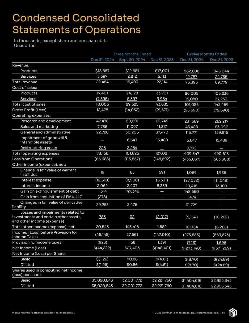 Condensed Consolidated Statements of Operations In thousands, except share and per share data Unaudited Three Months Ended Twelve Months Ended Dec 31, 2024 Sept 30, 2024 Dec 31, 2023 Dec 31, 2024 Dec 31, 2023 Revenue: Products $18,887 $12,681 $17,001 $62,608 $45,044 Services 3,597 2,812 5,113 12,787 24,735 Total revenue 22,484 15,493 22,114 75,395 69,779 Cost of sales: Products 17,401 24,128 33,701 86,005 105,236 Services (7,395) 5,397 9,984 15,080 37,233 Total cost of sales 10,006 29,525 43,685 101,085 142,469 Gross Profit (Loss) 12,478 (14,032) (21,571) (25,690) (72,690) Operating expenses: Research and development 47,478 50,591 62,745 231,669 262,217 Sales and marketing 7,736 11,097 11,317 45,488 53,097 General and administrative 22,726 30,206 37,470 115,771 159,815 Impairment of goodwill & intangible assets — 6,647 15,489 6,647 15,489 Restructuring costs 226 3,284 — 9,772 — Total operating expenses 78,166 101,825 127,021 409,347 490,618 Loss from Operations (65,688) (115,857) (148,592) (435,037) (563,308) Other income (expense), net: Change in fair value of warrant liabilities 19 65 591 1,069 1,936 Interest expense (12,610) (8,908) (5,331) (27,032) (11,048) Interest income 2,062 2,407 8,339 10,418 13,109 Gain on extinguishment of debt 1,314 147,346 — 148,660 — Gain from acquisition of EM4, LLC (278) — — 1,474 — Changes in fair value of derivative liability 29,253 2,476 — 31,729 — Losses and impairments related to investments and certain other assets, and other income (expense) 783 32 (2,017) (5,164) (10,262) Total other income (expense), net 20,543 143,418 1,582 161,154 (6,265) Income/ (Loss) before Provision for Income Taxes (45,145) 27,561 (147,010) (273,883) (569,573) Provision for income taxes (923) 158 1,391 (743) 1,696 Net Income (Loss) $(44,222) $27,403 $(148,401) $(273,140) $(571,269) Net Income (Loss) per Share: Basic $(1.26) $0.86 $(4.61) $(8.70) $(24.89) Diluted $(1.26) $0.86 $(4.61) $(8.70) $(24.89) Shares used in computing net income (loss) per share: Basic 35,020,843 32,001,772 32,221,760 31,404,616 22,955,345 Diluted 35,020,843 32,001,772 32,221,760 31,404,616 22,955,345 © 2025 Luminar Technologies, Inc. All rights reserved. | 34Please refer to Footnotes on slide 4 for more detail.