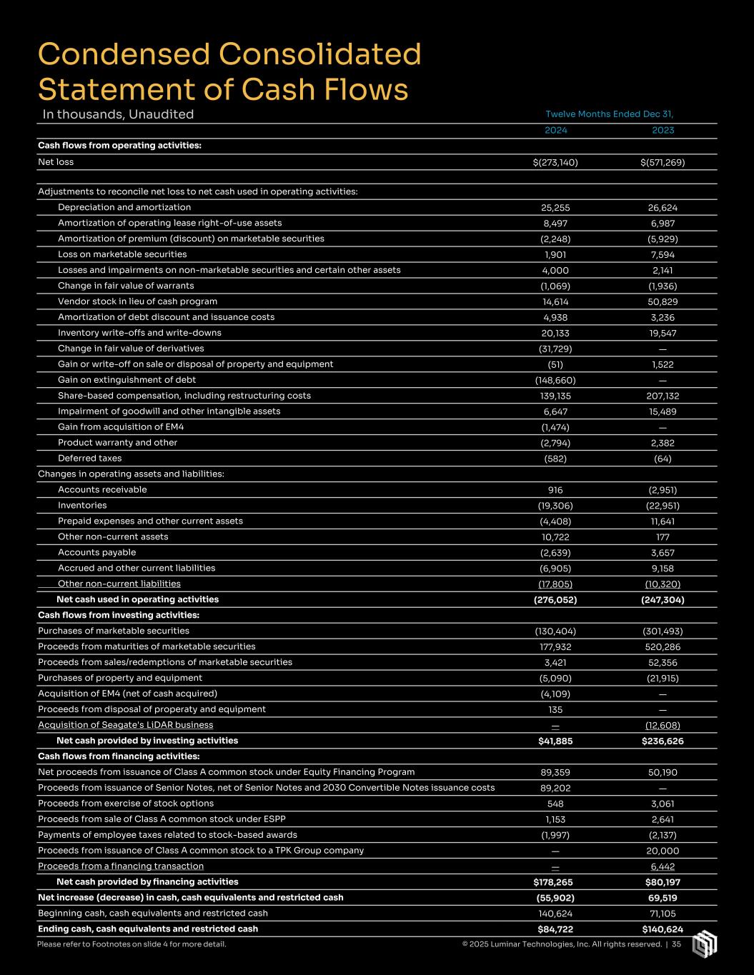 Twelve Months Ended Dec 31, 2024 2023 Cash flows from operating activities: Net loss $(273,140) $(571,269) Adjustments to reconcile net loss to net cash used in operating activities: Depreciation and amortization 25,255 26,624 Amortization of operating lease right-of-use assets 8,497 6,987 Amortization of premium (discount) on marketable securities (2,248) (5,929) Loss on marketable securities 1,901 7,594 Losses and impairments on non-marketable securities and certain other assets 4,000 2,141 Change in fair value of warrants (1,069) (1,936) Vendor stock in lieu of cash program 14,614 50,829 Amortization of debt discount and issuance costs 4,938 3,236 Inventory write-offs and write-downs 20,133 19,547 Change in fair value of derivatives (31,729) — Gain or write-off on sale or disposal of property and equipment (51) 1,522 Gain on extinguishment of debt (148,660) — Share-based compensation, including restructuring costs 139,135 207,132 Impairment of goodwill and other intangible assets 6,647 15,489 Gain from acquisition of EM4 (1,474) — Product warranty and other (2,794) 2,382 Deferred taxes (582) (64) Changes in operating assets and liabilities: Accounts receivable 916 (2,951) Inventories (19,306) (22,951) Prepaid expenses and other current assets (4,408) 11,641 Other non-current assets 10,722 177 Accounts payable (2,639) 3,657 Accrued and other current liabilities (6,905) 9,158 Other non-current liabilities (17,805) (10,320) Net cash used in operating activities (276,052) (247,304) Cash flows from investing activities: Purchases of marketable securities (130,404) (301,493) Proceeds from maturities of marketable securities 177,932 520,286 Proceeds from sales/redemptions of marketable securities 3,421 52,356 Purchases of property and equipment (5,090) (21,915) Acquisition of EM4 (net of cash acquired) (4,109) — Proceeds from disposal of properaty and equipment 135 — Acquisition of Seagate's LiDAR business — (12,608) Net cash provided by investing activities $41,885 $236,626 Cash flows from financing activities: Net proceeds from issuance of Class A common stock under Equity Financing Program 89,359 50,190 Proceeds from issuance of Senior Notes, net of Senior Notes and 2030 Convertible Notes issuance costs 89,202 — Proceeds from exercise of stock options 548 3,061 Proceeds from sale of Class A common stock under ESPP 1,153 2,641 Payments of employee taxes related to stock-based awards (1,997) (2,137) Proceeds from issuance of Class A common stock to a TPK Group company — 20,000 Proceeds from a financing transaction — 6,442 Net cash provided by financing activities $178,265 $80,197 Net increase (decrease) in cash, cash equivalents and restricted cash (55,902) 69,519 Beginning cash, cash equivalents and restricted cash 140,624 71,105 Ending cash, cash equivalents and restricted cash $84,722 $140,624 Condensed Consolidated Statement of Cash Flows In thousands, Unaudited © 2025 Luminar Technologies, Inc. All rights reserved. | 35Please refer to Footnotes on slide 4 for more detail.