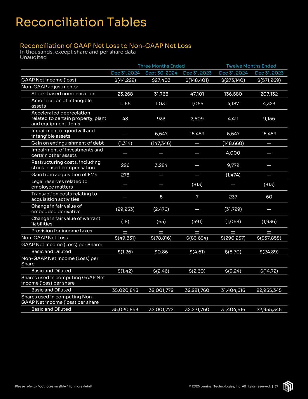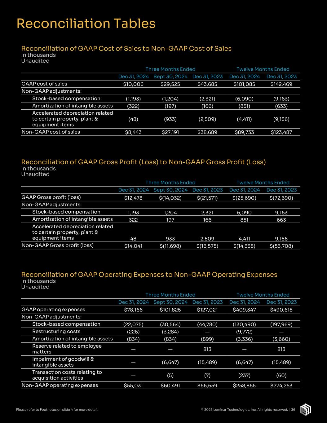 Reconciliation Tables Three Months Ended Twelve Months Ended Dec 31, 2024 Sept 30, 2024 Dec 31, 2023 Dec 31, 2024 Dec 31, 2023 GAAP Gross profit (loss) $12,478 $(14,032) $(21,571) $(25,690) $(72,690) Non-GAAP adjustments: Stock-based compensation 1,193 1,204 2,321 6,090 9,163 Amortization of intangible assets 322 197 166 851 663 Accelerated depreciation related to certain property, plant & equipment items 48 933 2,509 4,411 9,156 Non-GAAP Gross profit (loss) $14,041 $(11,698) $(16,575) $(14,338) $(53,708) Reconciliation of GAAP Cost of Sales to Non-GAAP Cost of Sales In thousands Unaudited Reconciliation of GAAP Gross Profit (Loss) to Non-GAAP Gross Profit (Loss) In thousands Unaudited Three Months Ended Twelve Months Ended Dec 31, 2024 Sept 30, 2024 Dec 31, 2023 Dec 31, 2024 Dec 31, 2023 GAAP operating expenses $78,166 $101,825 $127,021 $409,347 $490,618 Non-GAAP adjustments: Stock-based compensation (22,075) (30,564) (44,780) (130,490) (197,969) Restructuring costs (226) (3,284) — (9,772) — Amortization of intangible assets (834) (834) (899) (3,336) (3,660) Reserve related to employee matters — — 813 — 813 Impairment of goodwill & intangible assets — (6,647) (15,489) (6,647) (15,489) Transaction costs relating to acquisition activities — (5) (7) (237) (60) Non-GAAP operating expenses $55,031 $60,491 $66,659 $258,865 $274,253 Reconciliation of GAAP Operating Expenses to Non-GAAP Operating Expenses In thousands Unaudited Three Months Ended Twelve Months Ended Dec 31, 2024 Sept 30, 2024 Dec 31, 2023 Dec 31, 2024 Dec 31, 2023 GAAP cost of sales $10,006 $29,525 $43,685 $101,085 $142,469 Non-GAAP adjustments: Stock-based compensation (1,193) (1,204) (2,321) (6,090) (9,163) Amortization of intangible assets (322) (197) (166) (851) (633) Accelerated depreciation related to certain property, plant & equipment items (48) (933) (2,509) (4,411) (9,156) Non-GAAP cost of sales $8,443 $27,191 $38,689 $89,733 $123,487 © 2025 Luminar Technologies, Inc. All rights reserved. | 36Please refer to Footnotes on slide 4 for more detail.