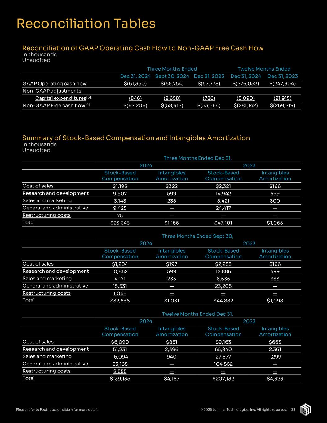 Reconciliation Tables Reconciliation of GAAP Operating Cash Flow to Non-GAAP Free Cash Flow In thousands Unaudited Summary of Stock-Based Compensation and Intangibles Amortization In thousands Unaudited Three Months Ended Twelve Months Ended Dec 31, 2024 Sept 30, 2024 Dec 31, 2023 Dec 31, 2024 Dec 31, 2023 GAAP Operating cash flow $(61,360) $(55,754) $(52,778) $(276,052) $(247,304) Non-GAAP adjustments: Capital expenditures[6]: (846) (2,658) (786) (5,090) (21,915) Non-GAAP Free cash flow[4] $(62,206) $(58,412) $(53,564) $(281,142) $(269,219) Three Months Ended Dec 31, 2024 2023 Stock-Based Compensation Intangibles Amortization Stock-Based Compensation Intangibles Amortization Cost of sales $1,193 $322 $2,321 $166 Research and development 9,507 599 14,942 599 Sales and marketing 3,143 235 5,421 300 General and administrative 9,425 — 24,417 — Restructuring costs 75 — — — Total $23,343 $1,156 $47,101 $1,065 Three Months Ended Sept 30, 2024 2023 Stock-Based Compensation Intangibles Amortization Stock-Based Compensation Intangibles Amortization Cost of sales $1,204 $197 $2,255 $166 Research and development 10,862 599 12,886 599 Sales and marketing 4,171 235 6,536 333 General and administrative 15,531 — 23,205 — Restructuring costs 1,068 — — — Total $32,836 $1,031 $44,882 $1,098 Twelve Months Ended Dec 31, 2024 2023 Stock-Based Compensation Intangibles Amortization Stock-Based Compensation Intangibles Amortization Cost of sales $6,090 $851 $9,163 $663 Research and development 51,231 2,396 65,840 2,361 Sales and marketing 16,094 940 27,577 1,299 General and administrative 63,165 — 104,552 — Restructuring costs 2,555 — — — Total $139,135 $4,187 $207,132 $4,323 Please refer to Footnotes on slide 4 for more detail. © 2025 Luminar Technologies, Inc. All rights reserved. | 38