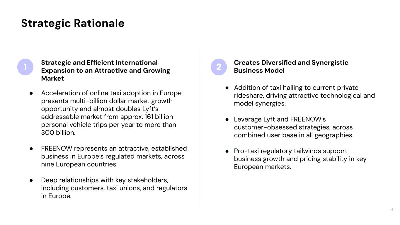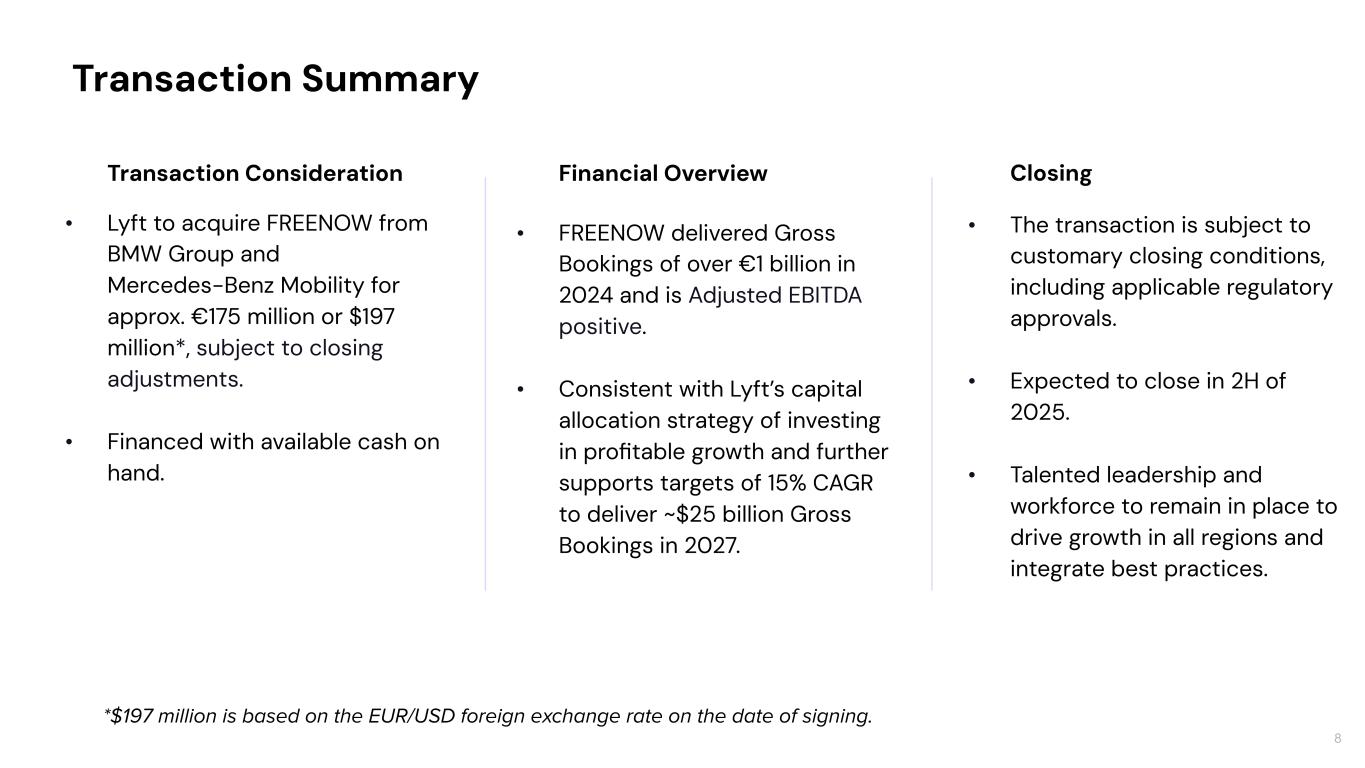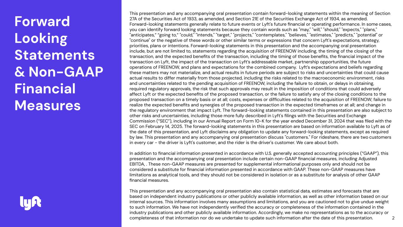 Forward Looking Statements & Non-GAAP Financial Measures 2 This presentation and any accompanying oral presentation contain forward-looking statements within the meaning of Section 27A of the Securities Act of 1933, as amended, and Section 21E of the Securities Exchange Act of 1934, as amended. Forward-looking statements generally relate to future events or Lyft's future financial or operating performance. In some cases, you can identify forward looking statements because they contain words such as "may," "will," "should," "expects," "plans," "anticipates,” “going to,” "could," "intends," "target," "projects," "contemplates," "believes," "estimates," "predicts," "potential" or "continue" or the negative of these words or other similar terms or expressions that concern Lyft's expectations, strategy, priorities, plans or intentions. Forward-looking statements in this presentation and the accompanying oral presentation include, but are not limited to, statements regarding the acquisition of FREENOW including, the timing of the closing of the transaction, and the expected benefits of the transaction, including the timing of those benefits, the financial impact of the transaction on Lyft, the impact of the transaction on Lyft’s addressable market, partnership opportunities, the future operations of FREENOW, and plans and expectations for the combined company. Lyft’s expectations and beliefs regarding these matters may not materialize, and actual results in future periods are subject to risks and uncertainties that could cause actual results to differ materially from those projected, including the risks related to the macroeconomic environment, risks and uncertainties related to the pending acquisition of FREENOW, including the failure to obtain, or delays in obtaining, required regulatory approvals, the risk that such approvals may result in the imposition of conditions that could adversely affect Lyft or the expected benefits of the proposed transaction, or the failure to satisfy any of the closing conditions to the proposed transaction on a timely basis or at all; costs, expenses or difficulties related to the acquisition of FREENOW; failure to realize the expected benefits and synergies of the proposed transaction in the expected timeframes or at all; and change in the regulatory environment that impact Lyft. The forward-looking statements contained in this presentation are also subject to other risks and uncertainties, including those more fully described in Lyft's filings with the Securities and Exchange Commission (“SEC”), including in our Annual Report on Form 10-K for the year ended December 31, 2024 that was filed with the SEC on February 14, 2025. The forward-looking statements in this presentation are based on information available to Lyft as of the date of this presentation, and Lyft disclaims any obligation to update any forward-looking statements, except as required by law. This presentation and any accompanying oral presentation discuss "customers." For rideshare, there are two customers in every car - the driver is Lyft's customer, and the rider is the driver's customer. We care about both. In addition to financial information presented in accordance with U.S. generally accepted accounting principles (“GAAP”), this presentation and the accompanying oral presentation include certain non-GAAP financial measures, including Adjusted EBITDA, . These non-GAAP measures are presented for supplemental informational purposes only and should not be considered a substitute for financial information presented in accordance with GAAP. These non-GAAP measures have limitations as analytical tools, and they should not be considered in isolation or as a substitute for analysis of other GAAP financial measures. This presentation and any accompanying oral presentation also contain statistical data, estimates and forecasts that are based on independent industry publications or other publicly available information, as well as other information based on our internal sources. This information involves many assumptions and limitations, and you are cautioned not to give undue weight to such information. We have not independently verified the accuracy or completeness of the information contained in the industry publications and other publicly available information. Accordingly, we make no representations as to the accuracy or completeness of that information nor do we undertake to update such information after the date of this presentation.