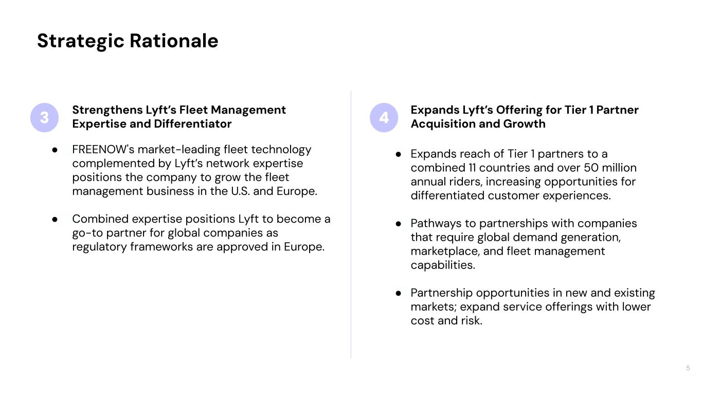 4 Strategic Rationale Strategic and Efficient International Expansion to an Attractive and Growing Market ● Acceleration of online taxi adoption in Europe presents multi-billion dollar market growth opportunity and almost doubles Lyft’s addressable market from approx. 161 billion personal vehicle trips per year to more than 300 billion. ● FREENOW represents an attractive, established business in Europe’s regulated markets, across nine European countries. ● Deep relationships with key stakeholders, including customers, taxi unions, and regulators in Europe. 1 Creates Diversified and Synergistic Business Model ● Addition of taxi hailing to current private rideshare, driving attractive technological and model synergies. ● Leverage Lyft and FREENOW’s customer-obsessed strategies, across combined user base in all geographies. ● Pro-taxi regulatory tailwinds support business growth and pricing stability in key European markets. 2