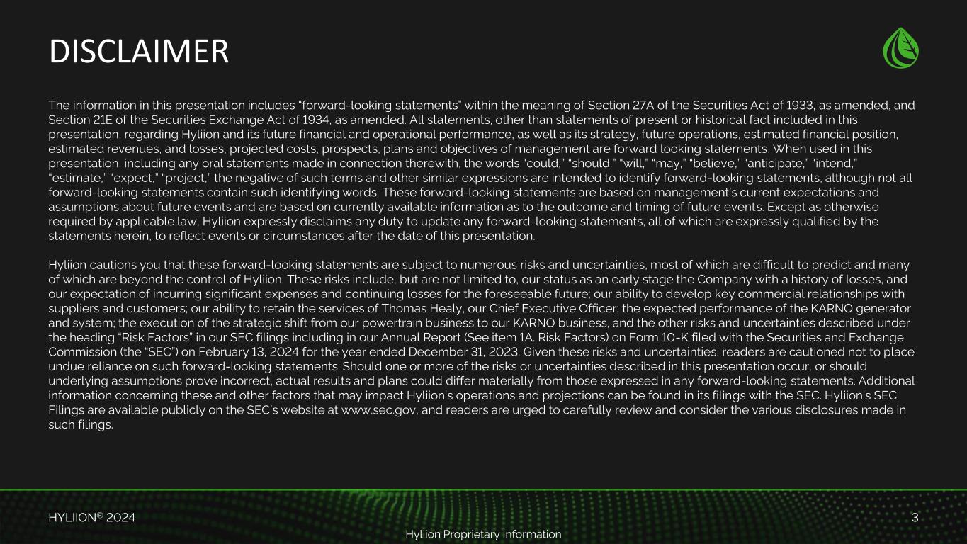 DISCLAIMER 3 The information in this presentation includes “forward-looking statements” within the meaning of Section 27A of the Securities Act of 1933, as amended, and Section 21E of the Securities Exchange Act of 1934, as amended. All statements, other than statements of present or historical fact included in this presentation, regarding Hyliion and its future financial and operational performance, as well as its strategy, future operations, estimated financial position, estimated revenues, and losses, projected costs, prospects, plans and objectives of management are forward looking statements. When used in this presentation, including any oral statements made in connection therewith, the words “could,” “should,” “will,” “may,” “believe,” “anticipate,” “intend,” “estimate,” “expect,” “project,” the negative of such terms and other similar expressions are intended to identify forward-looking statements, although not all forward-looking statements contain such identifying words. These forward-looking statements are based on management’s current expectations and assumptions about future events and are based on currently available information as to the outcome and timing of future events. Except as otherwise required by applicable law, Hyliion expressly disclaims any duty to update any forward-looking statements, all of which are expressly qualified by the statements herein, to reflect events or circumstances after the date of this presentation. Hyliion cautions you that these forward-looking statements are subject to numerous risks and uncertainties, most of which are difficult to predict and many of which are beyond the control of Hyliion. These risks include, but are not limited to, our status as an early stage the Company with a history of losses, and our expectation of incurring significant expenses and continuing losses for the foreseeable future; our ability to develop key commercial relationships with suppliers and customers; our ability to retain the services of Thomas Healy, our Chief Executive Officer; the expected performance of the KARNO generator and system; the execution of the strategic shift from our powertrain business to our KARNO business, and the other risks and uncertainties described under the heading “Risk Factors” in our SEC filings including in our Annual Report (See item 1A. Risk Factors) on Form 10-K filed with the Securities and Exchange Commission (the “SEC”) on February 13, 2024 for the year ended December 31, 2023. Given these risks and uncertainties, readers are cautioned not to place undue reliance on such forward-looking statements. Should one or more of the risks or uncertainties described in this presentation occur, or should underlying assumptions prove incorrect, actual results and plans could differ materially from those expressed in any forward-looking statements. Additional information concerning these and other factors that may impact Hyliion’s operations and projections can be found in its filings with the SEC. Hyliion’s SEC Filings are available publicly on the SEC’s website at www.sec.gov, and readers are urged to carefully review and consider the various disclosures made in such filings. HYLIION® 2024 Hyliion Proprietary Information