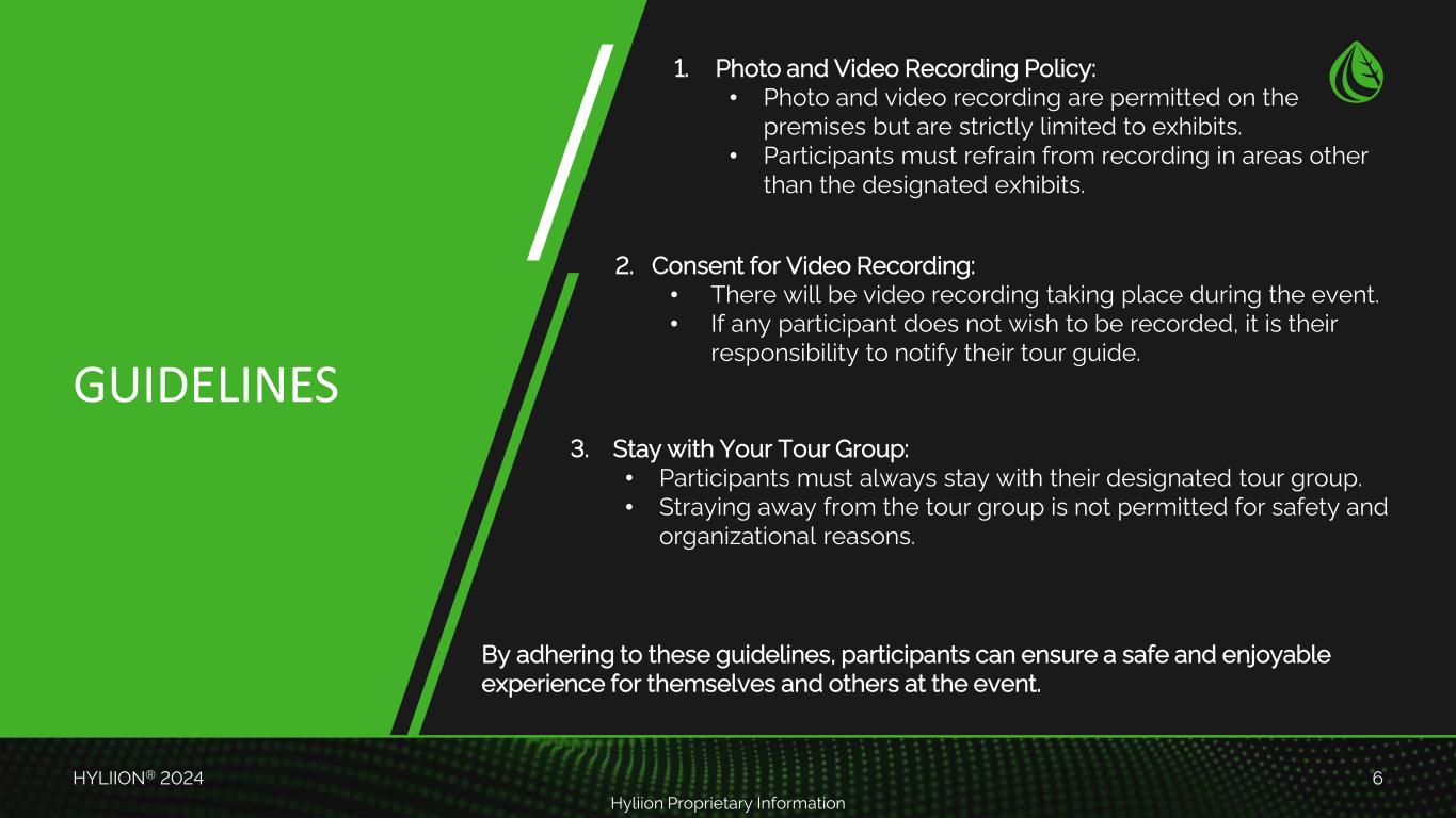 GUIDELINES 1. Photo and Video Recording Policy: • Photo and video recording are permitted on the premises but are strictly limited to exhibits. • Participants must refrain from recording in areas other than the designated exhibits. By adhering to these guidelines, participants can ensure a safe and enjoyable experience for themselves and others at the event. 2. Consent for Video Recording: • There will be video recording taking place during the event. • If any participant does not wish to be recorded, it is their responsibility to notify their tour guide. 3. Stay with Your Tour Group: • Participants must always stay with their designated tour group. • Straying away from the tour group is not permitted for safety and organizational reasons. 6HYLIION® 2024 Hyliion Proprietary Information