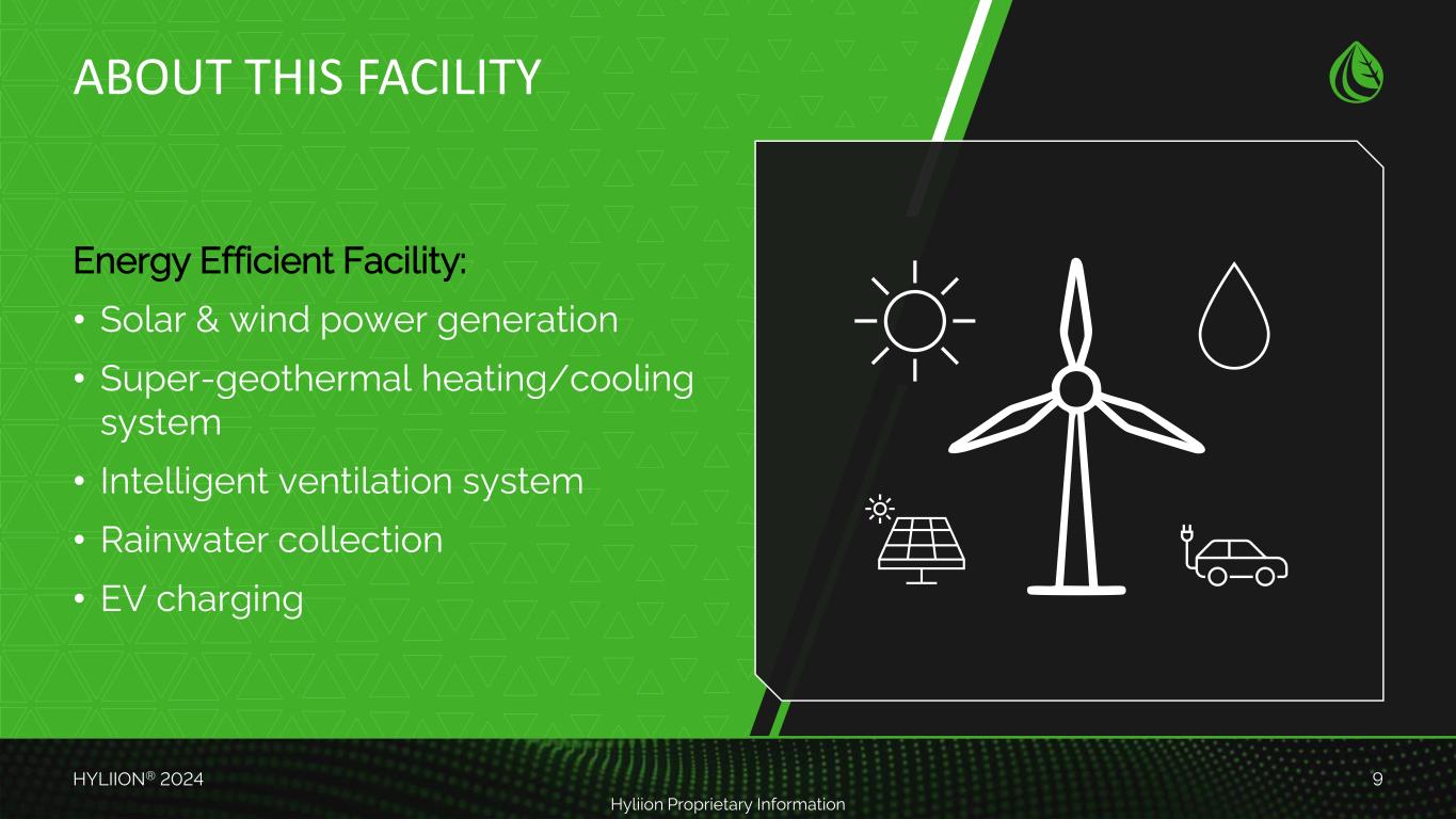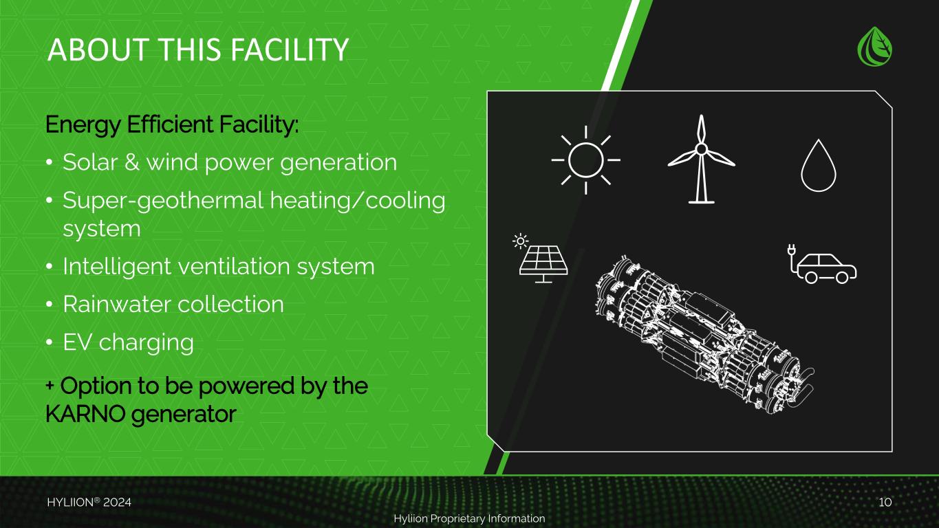 ABOUT THIS FACILITY Energy Efficient Facility: • Solar & wind power generation • Super-geothermal heating/cooling system • Intelligent ventilation system • Rainwater collection • EV charging 9HYLIION® 2024 Hyliion Proprietary Information
