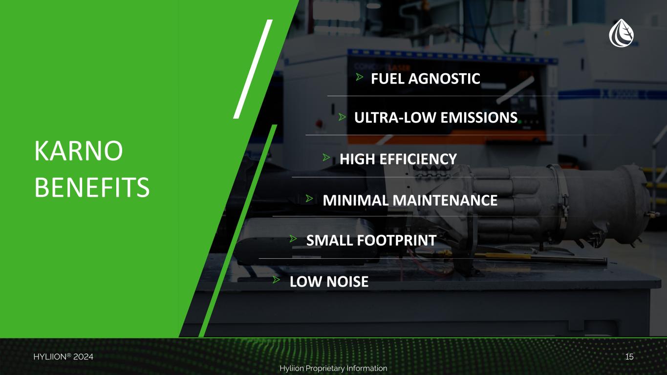 KARNO TECHNOLOGY Electricity, 50% Useful Heat, 40% Unrecoverable Losses, 10% • Pumps & Accessories • Generation Losses • Exhaust Heat • Non-Ideal Cycle • Friction • Combustion Losses ENERGY An innovative, heat- powered linear generator that leverages Stirling technology and flameless oxidation to produce electricity REACTOR COOLER GENERATOR COOLER 14HYLIION® 2024 REACTORHEATERHEATER Hyliion Proprietary Information