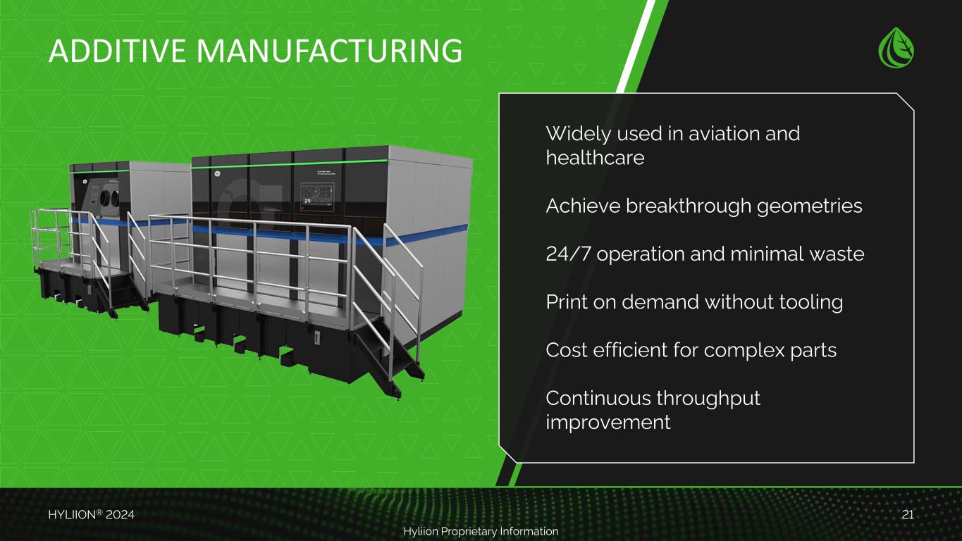 ADDITIVE MANUFACTURING Widely used in aviation and healthcare Achieve breakthrough geometries 24/7 operation and minimal waste Print on demand without tooling Cost efficient for complex parts Continuous throughput improvement 21HYLIION® 2024 Hyliion Proprietary Information