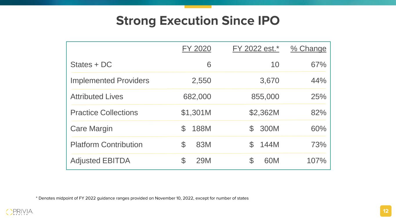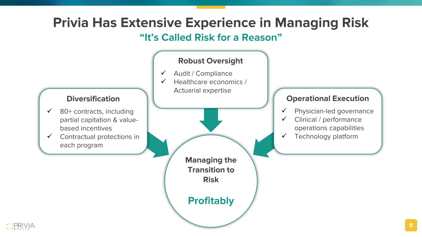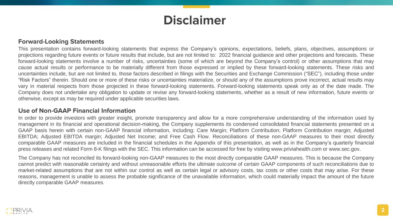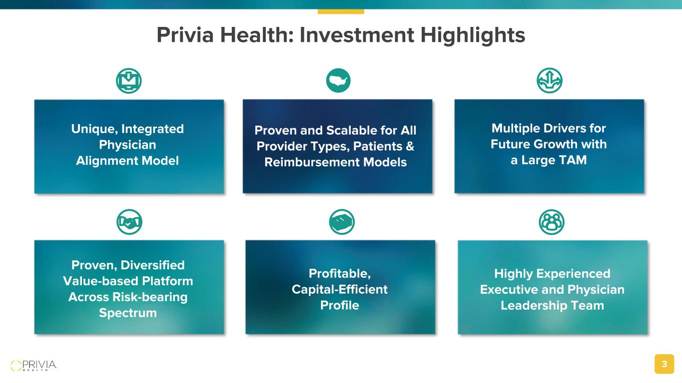 2 Forward-Looking Statements This presentation contains forward-looking statements that express the Company’s opinions, expectations, beliefs, plans, objectives, assumptions or projections regarding future events or future results that include, but are not limited to: 2022 financial guidance and other projections and forecasts. These forward-looking statements involve a number of risks, uncertainties (some of which are beyond the Company’s control) or other assumptions that may cause actual results or performance to be materially different from those expressed or implied by these forward-looking statements. These risks and uncertainties include, but are not limited to, those factors described in filings with the Securities and Exchange Commission (“SEC”), including those under “Risk Factors” therein. Should one or more of these risks or uncertainties materialize, or should any of the assumptions prove incorrect, actual results may vary in material respects from those projected in these forward-looking statements. Forward-looking statements speak only as of the date made. The Company does not undertake any obligation to update or revise any forward-looking statements, whether as a result of new information, future events or otherwise, except as may be required under applicable securities laws. Use of Non-GAAP Financial Information In order to provide investors with greater insight, promote transparency and allow for a more comprehensive understanding of the information used by management in its financial and operational decision-making, the Company supplements its condensed consolidated financial statements presented on a GAAP basis herein with certain non-GAAP financial information, including: Care Margin; Platform Contribution; Platform Contribution margin; Adjusted EBITDA; Adjusted EBITDA margin; Adjusted Net Income; and Free Cash Flow. Reconciliations of these non-GAAP measures to their most directly comparable GAAP measures are included in the financial schedules in the Appendix of this presentation, as well as in the Company’s quarterly financial press releases and related Form 8-K filings with the SEC. This information can be accessed for free by visiting www.priviahealth.com or www.sec.gov. The Company has not reconciled its forward-looking non-GAAP measures to the most directly comparable GAAP measures. This is because the Company cannot predict with reasonable certainty and without unreasonable efforts the ultimate outcome of certain GAAP components of such reconciliations due to market-related assumptions that are not within our control as well as certain legal or advisory costs, tax costs or other costs that may arise. For these reasons, management is unable to assess the probable significance of the unavailable information, which could materially impact the amount of the future directly comparable GAAP measures. Disclaimer