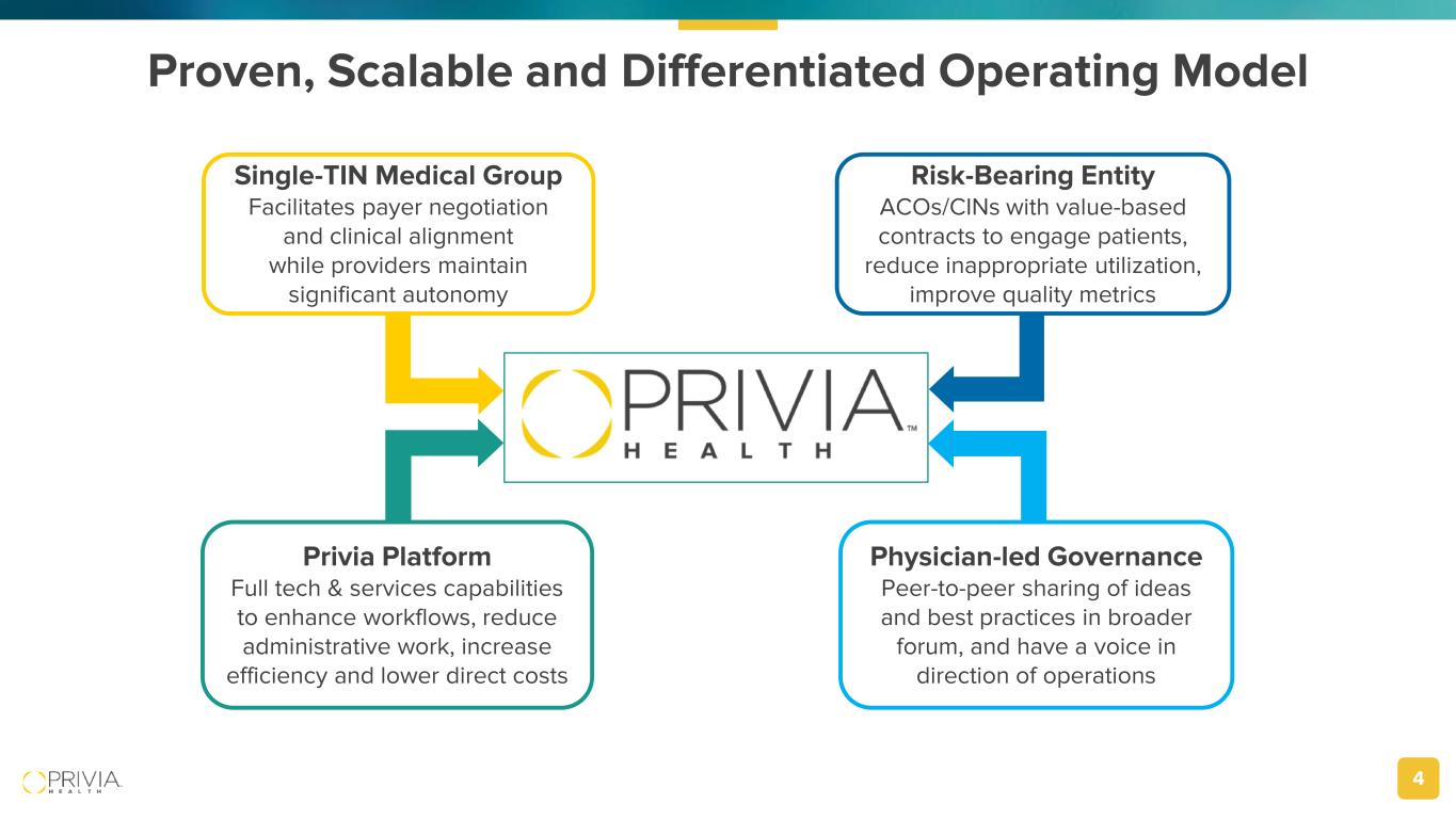 3 Privia Health: Investment Highlights Proven and Scalable for All Provider Types, Patients & Reimbursement Models Multiple Drivers for Future Growth with a Large TAM Unique, Integrated Physician Alignment Model Profitable, Capital-Efficient Profile Proven, Diversified Value-based Platform Across Risk-bearing Spectrum Highly Experienced Executive and Physician Leadership Team