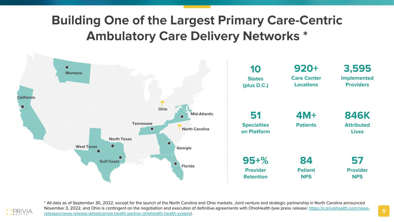 4 Proven, Scalable and Differentiated Operating Model Single-TIN Medical Group Facilitates payer negotiation and clinical alignment while providers maintain significant autonomy Risk-Bearing Entity ACOs/CINs with value-based contracts to engage patients, reduce inappropriate utilization, improve quality metrics Privia Platform Full tech & services capabilities to enhance workflows, reduce administrative work, increase efficiency and lower direct costs Physician-led Governance Peer-to-peer sharing of ideas and best practices in broader forum, and have a voice in direction of operations